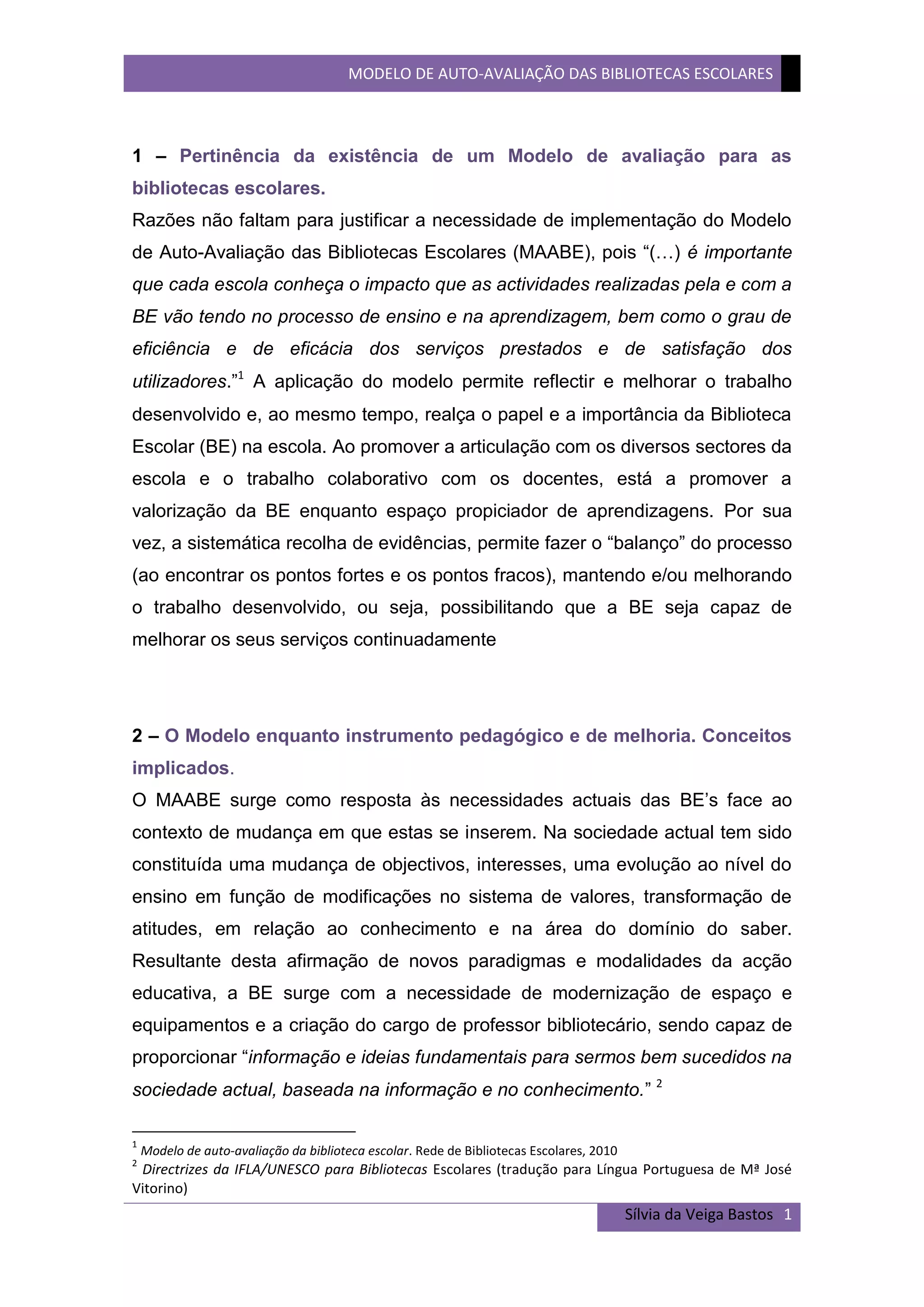 Este documento discute a importância de um Modelo de Auto-Avaliação para Bibliotecas Escolares (MAABE) para melhorar os serviços das bibliotecas e promover o sucesso educativo dos alunos. O MAABE é dividido em quatro domínios avaliados ao longo de quatro anos para fornecer flexibilidade. No entanto, a aplicação completa do modelo pode sobrecarregar as bibliotecas devido à grande quantidade de dados necessários para a avaliação.