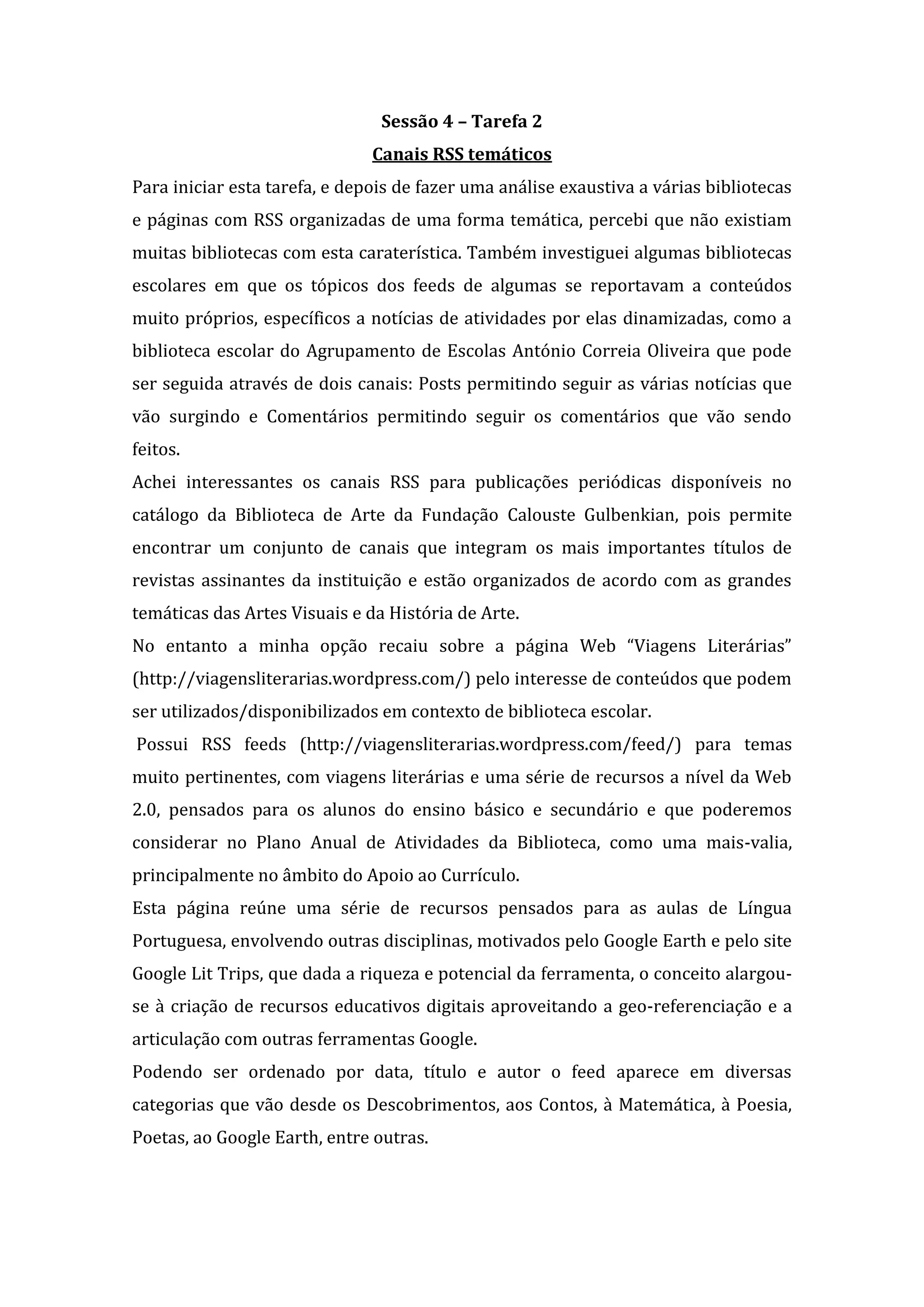 O documento discute canais RSS temáticos e opções para agregação de conteúdo para bibliotecas escolares. A opção recai sobre o site "Viagens Literárias" por seus feeds pertinentes em categorias como Descobrimentos, Contos e Poesia, atualizados frequentemente.