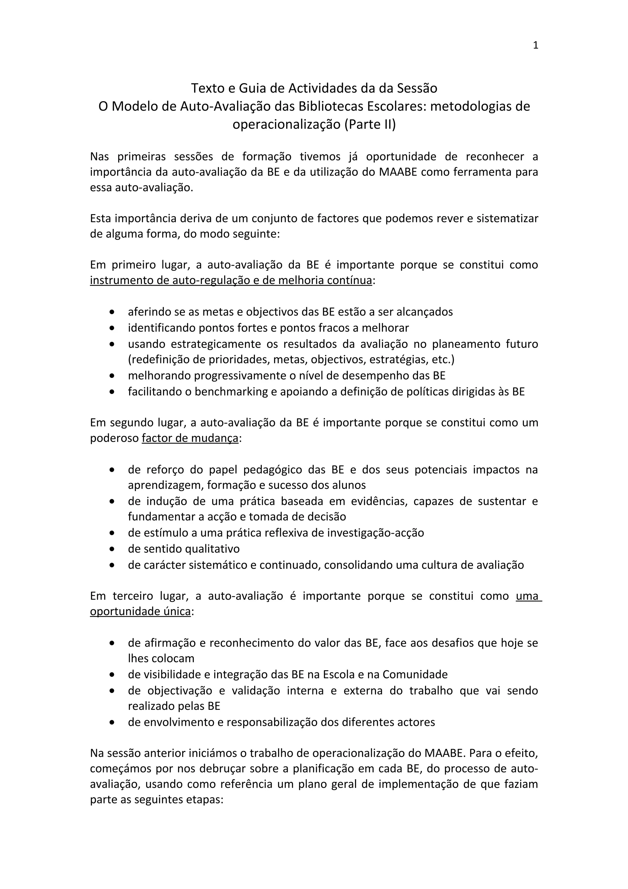 Este documento fornece orientações sobre como operacionalizar o Modelo de Auto-Avaliação das Bibliotecas Escolares (MAABE) na parte II da formação. Discute a importância da auto-avaliação e identifica fontes de evidências, como documentos da escola e instrumentos do MAABE. Detalha como analisar os instrumentos do MAABE para o Subdomínio A2 e fornece exemplos de como formular enunciados avaliativos com base nos dados coletados.