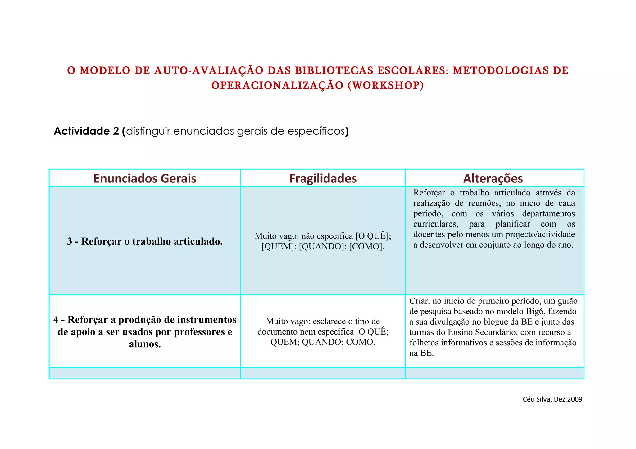 Este documento discute a auto-avaliação de bibliotecas escolares. Ele fornece exemplos de enunciados gerais versus específicos e sugere alterações para tornar os enunciados mais claros e mensuráveis.