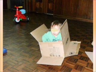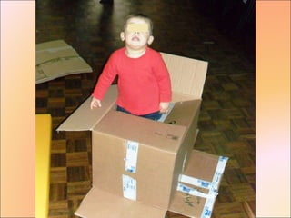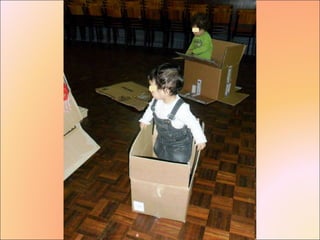 Duas crianças brincam com caixas de cartão, com uma emprestando a caixa para a outra, mas sentindo-se apertada dentro da caixa e sugerindo que as caixas são para uma pessoa só.