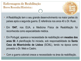 O documento descreve a história da enfermagem de reabilitação em Portugal desde a segunda guerra mundial até 2008. Detalha os marcos iniciais da especialidade nos anos 50 e 60, o primeiro curso de especialização em 1965, e o estabelecimento da Associação Portuguesa dos Enfermeiros Especializados em Enfermagem de Reabilitação em 1978 para promover a profissão. Também lista os primeiros líderes e presidentes da associação.