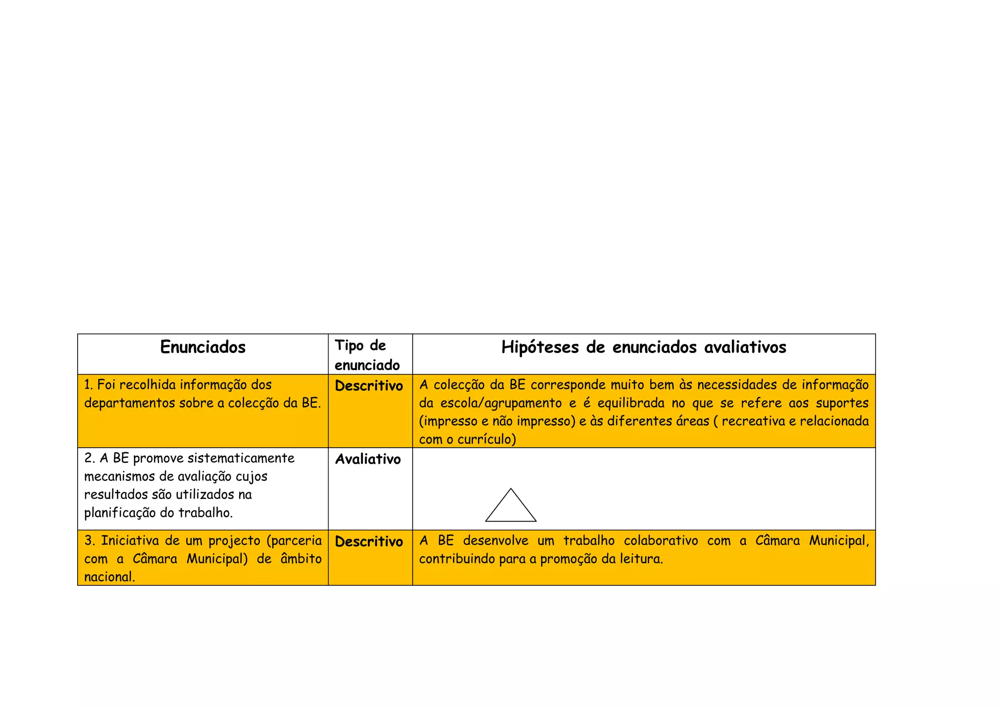 O documento discute a avaliação da biblioteca escolar (BE) em 7 pontos. A BE coleta informações sobre sua coleção, promove mecanismos de avaliação sistemática, e desenvolve um projeto colaborativo com a Câmara Municipal para promover a leitura. A BE também envolve as famílias em projetos de leitura e mantém um horário que cobre todo o tempo de abertura da escola.