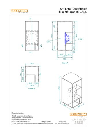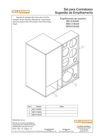Este documento fornece especificações e instruções para um conjunto de caixas acústicas para contrabaixo composto por três modelos: BS118 BASS, MB115 BASS e MD410 BASS. Ele inclui dimensões, componentes, volumes internos e instruções de montagem para cada modelo.
