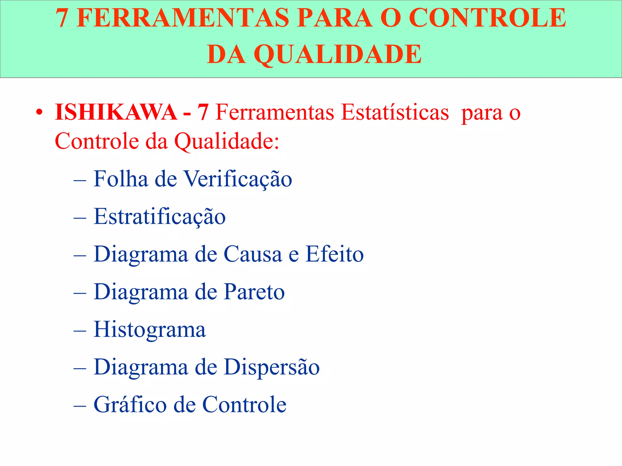 O documento descreve sete ferramentas estatísticas para controle da qualidade propostas por Ishikawa: folha de verificação, estratificação, diagrama de causas e efeitos, diagrama de Pareto, histograma, diagrama de dispersão e gráficos de controle. Essas ferramentas podem resolver aproximadamente 95% dos problemas de qualidade em qualquer organização.