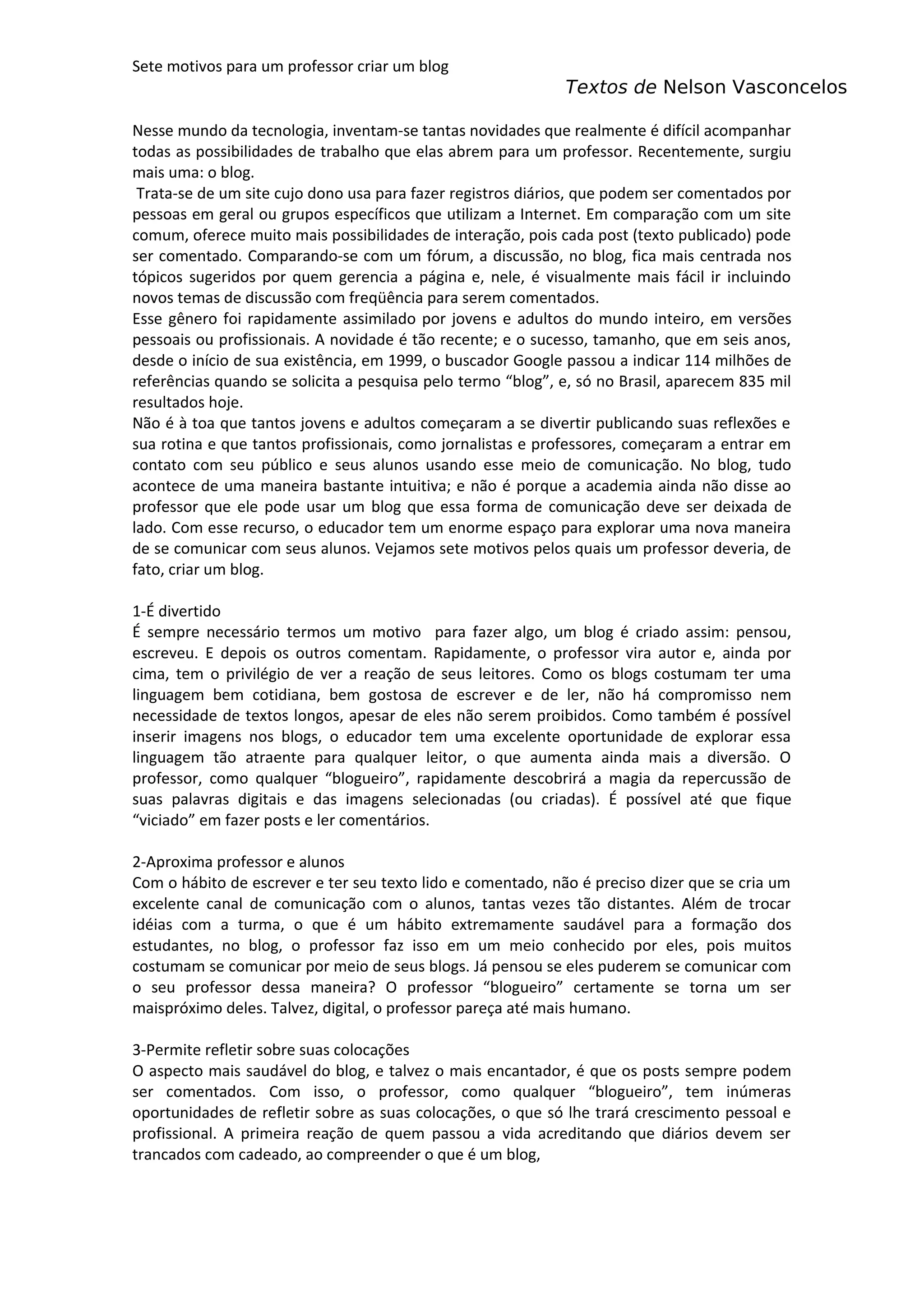 O documento lista sete motivos para um professor criar um blog: 1) É divertido escrever posts e ler comentários; 2) Um blog aproxima professor e alunos e permite uma comunicação mais próxima; 3) Escrever posts permite aos professores refletir sobre suas próprias opiniões; 4) Um blog conecta o professor ao mundo por meio de links; 5) Um blog permite ampliar a discussão de temas da aula; 6) Um blog possibilita a troca de experiências entre professores; 7) Um blog torna o trabalho do professor mais visível.