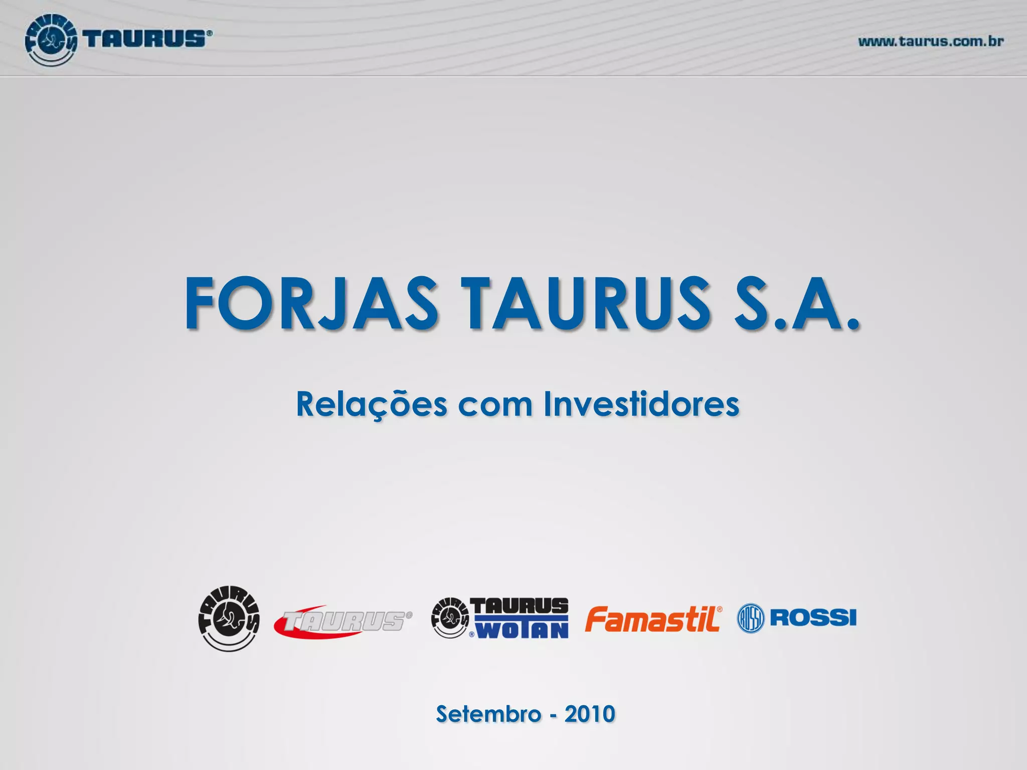 Este documento fornece uma visão geral da Forjas Taurus S.A., incluindo seus negócios principais (armas, capacetes, máquinas), perfil da empresa e histórico. Apresenta também a estrutura organizacional da empresa e resultados consolidados até setembro de 2010.