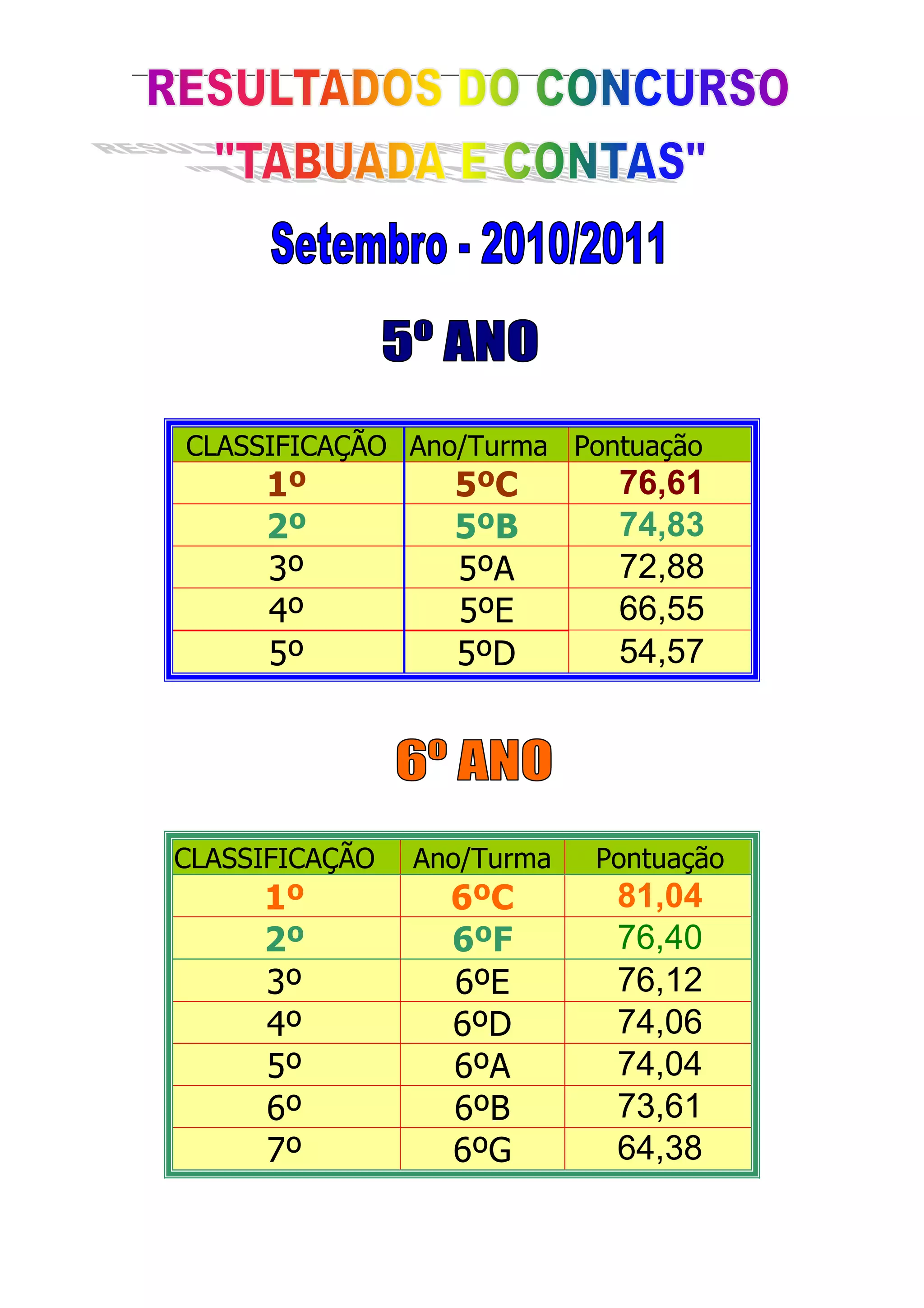 A tabela mostra a classificação de turmas de 5o e 6o ano de acordo com suas pontuações. No 5o ano, a turma 5C ficou em 1o lugar com 76,61 pontos, enquanto a turma 5D ficou em último com 54,57 pontos. No 6o ano, a turma 6C ficou em 1o lugar com 81,04 pontos, enquanto a turma 6G ficou em último com 64,38 pontos.