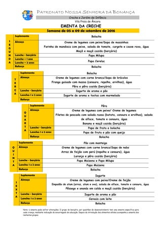 O documento apresenta as ementas semanais da creche Patronato Nossa Senhora da Bonança em Vila Praia de Âncora, incluindo refeições e lanches para as crianças de berçário, 1 e 2 anos. As ementas variam diariamente e incluem sopas, pratos de peixe, carne ou legumes, saladas e sobremesas diferentes.