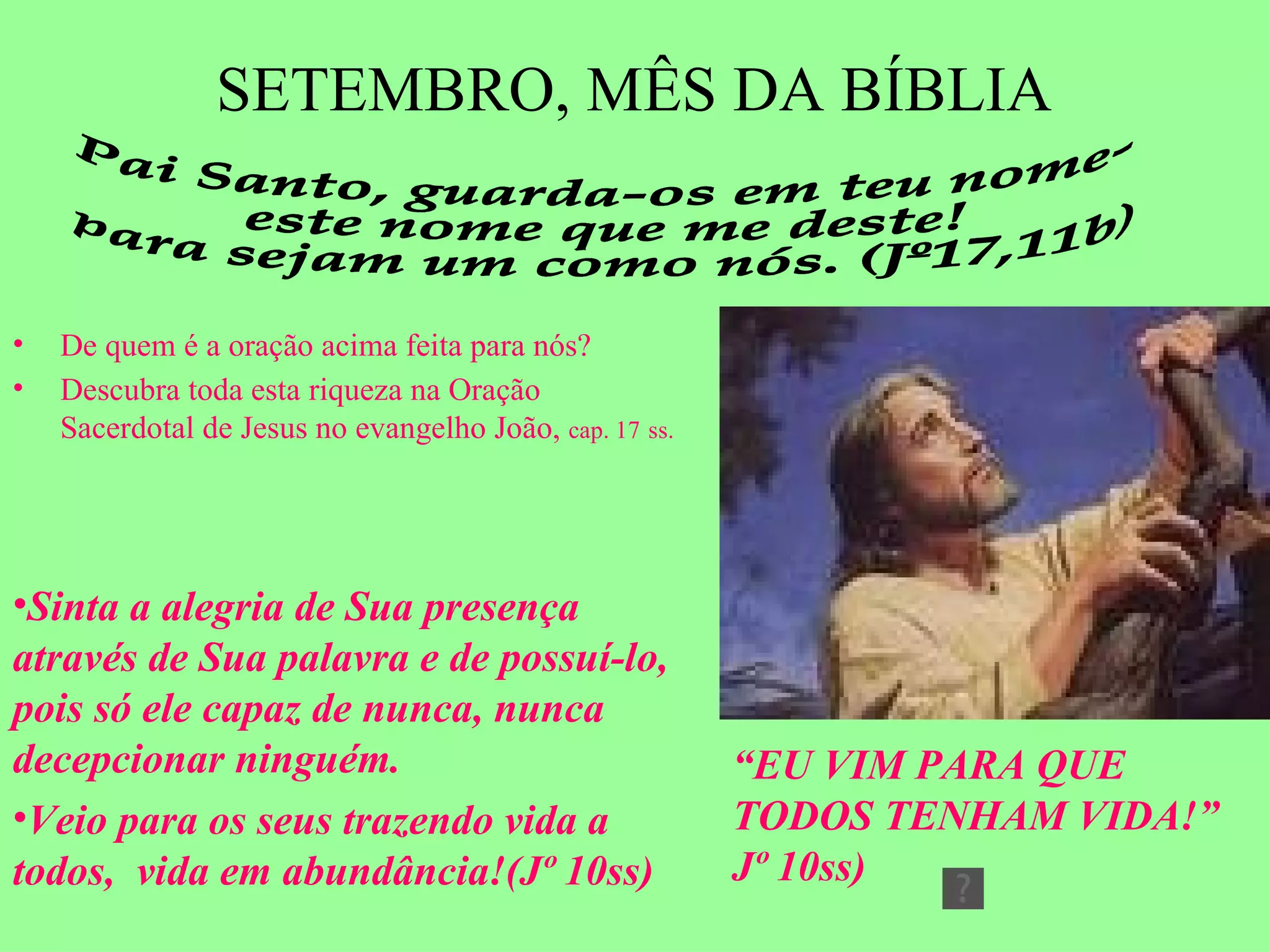 O documento fala sobre o mês de setembro como mês da Bíblia e celebra os 1589 anos de São Jerônimo. São Jerônimo traduziu a Bíblia para o latim e viveu por 34 anos em uma gruta em Belém estudando os textos sagrados. O documento também menciona a amizade entre São Jerônimo e Santo Agostinho.