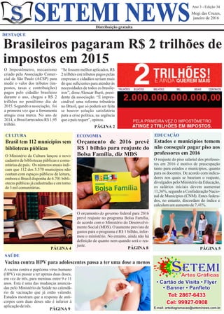 Brasileiros pagaram R$ 2 trilhões de impostos em 2015. Estados e municípios temem não conseguir pagar o aumento de 11,36% no piso salarial dos professores em 2016 devido à crise fiscal. O orçamento federal de 2016 prevê R$ 1 bilhão para reajuste do programa Bolsa Família.