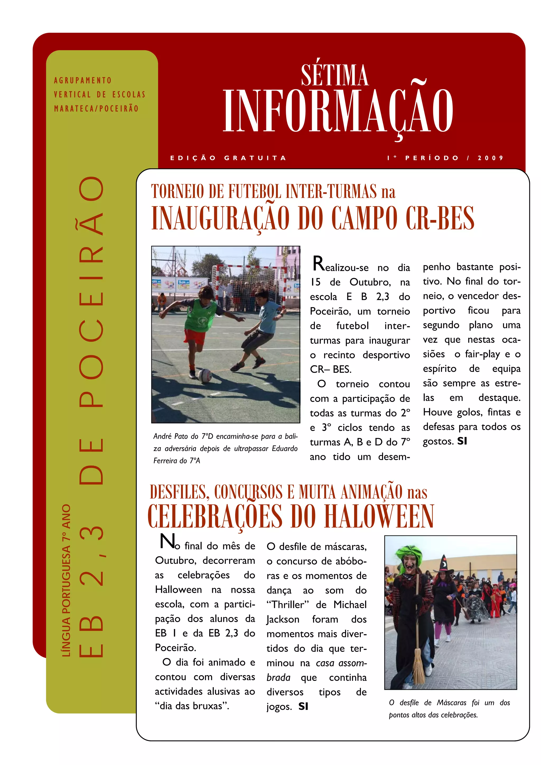 O documento descreve três eventos realizados na escola EB 2,3 de Poceirão: 1) Um torneio de futebol inter-turmas para inaugurar o campo de futebol; 2) Celebrações do Halloween com desfiles de máscaras e concursos; 3) Uma entrevista com a diretora da escola, Manuela Costeira.