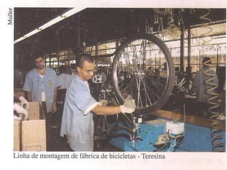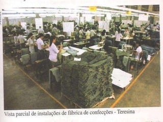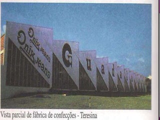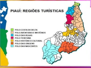 O documento descreve a história econômica do Piauí, dividida em quatro ciclos desde o século 17 até os dias atuais. Inicialmente baseada na pecuária extensiva e agricultura de subsistência, passou por períodos de decadência e expansão da exportação agrícola e extrativa. Atualmente a economia é baseada na indústria, agricultura e pecuária, com importante setor terciário de serviços e comércio. A economia do estado caracteriza-se pela importância das atividades primárias e ba