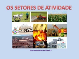 O documento descreve os três setores de atividade econômica: o setor primário inclui agricultura e extração de recursos; o setor secundário engloba indústrias que transformam matérias-primas; e o setor terciário compreende comércio e serviços como saúde, educação e turismo.