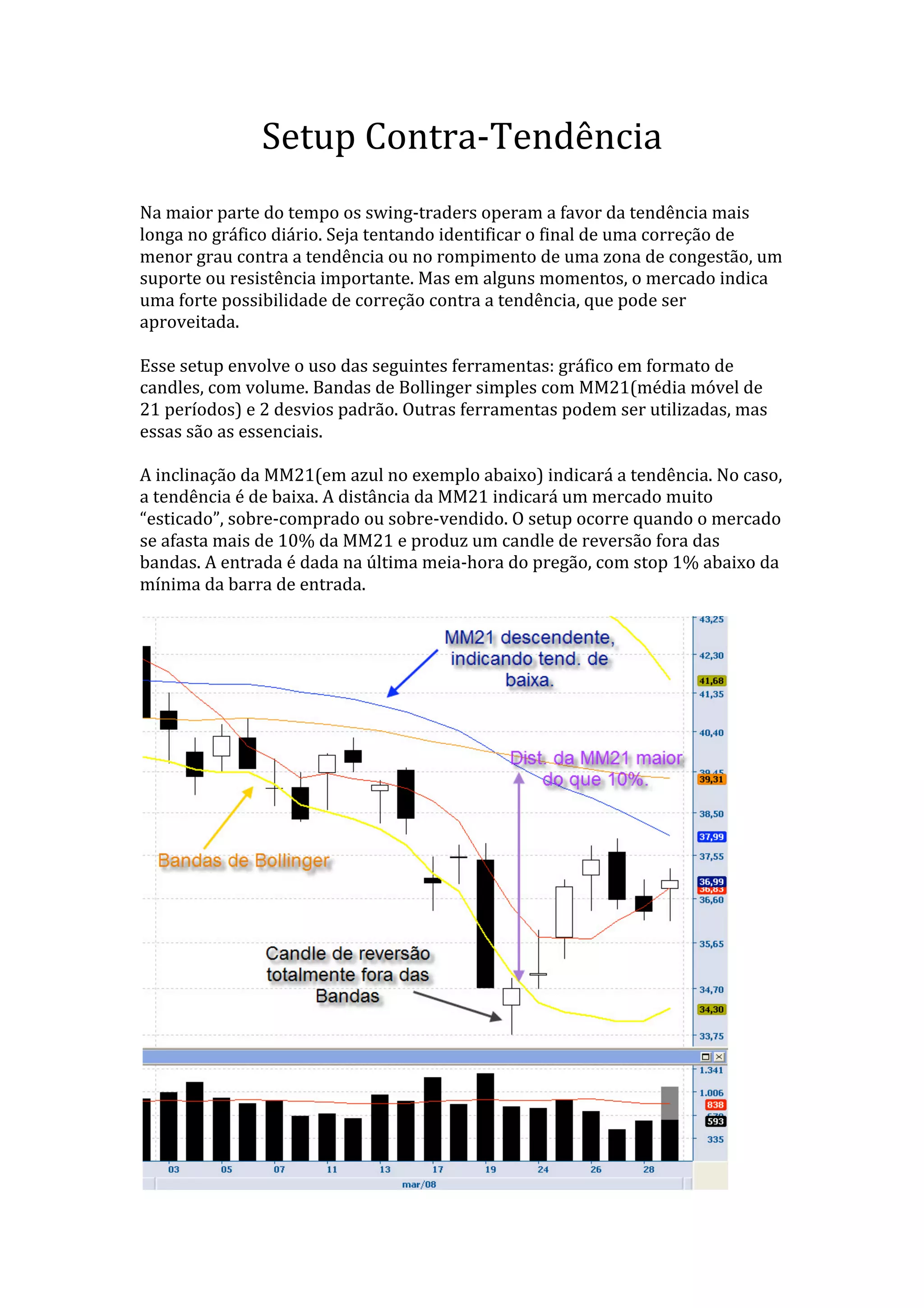 Este documento descreve uma estratégia de swing trading que opera contra a tendência, identificando oportunidades de correção. Ela usa média móvel de 21 períodos, bandas de Bollinger e gráficos de velas com volume para identificar quando o mercado está muito distante da média móvel e fora das bandas, indicando uma possível correção. A entrada é dada na última meia hora do pregão com stop 1% abaixo do preço de entrada e saídas parciais a 3% de lucro.