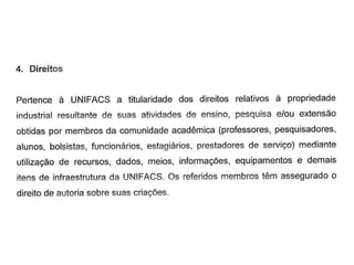 Este documento discute a inovação e a Agência de Inovação UNIFACS, que fomenta as engenharias. Ele explica conceitos como invenção, gestão da inovação e mecanismos de proteção intelectual como patentes. Também discute como fomentar as engenharias, os desafios futuros da área e o papel da agência no ecossistema da UNIFACS.