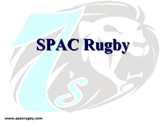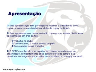 O documento apresenta o trabalho do SPAC Rugby, o maior clube de rugby do Brasil, dividindo-o em três partes: o trabalho no clube, o Torneio Lion's e como ajudar nesse trabalho. O SPAC é referência no rugby nacional e promove diversos eventos ao longo do ano, como o tradicional torneio SPAC Lion's 7s.