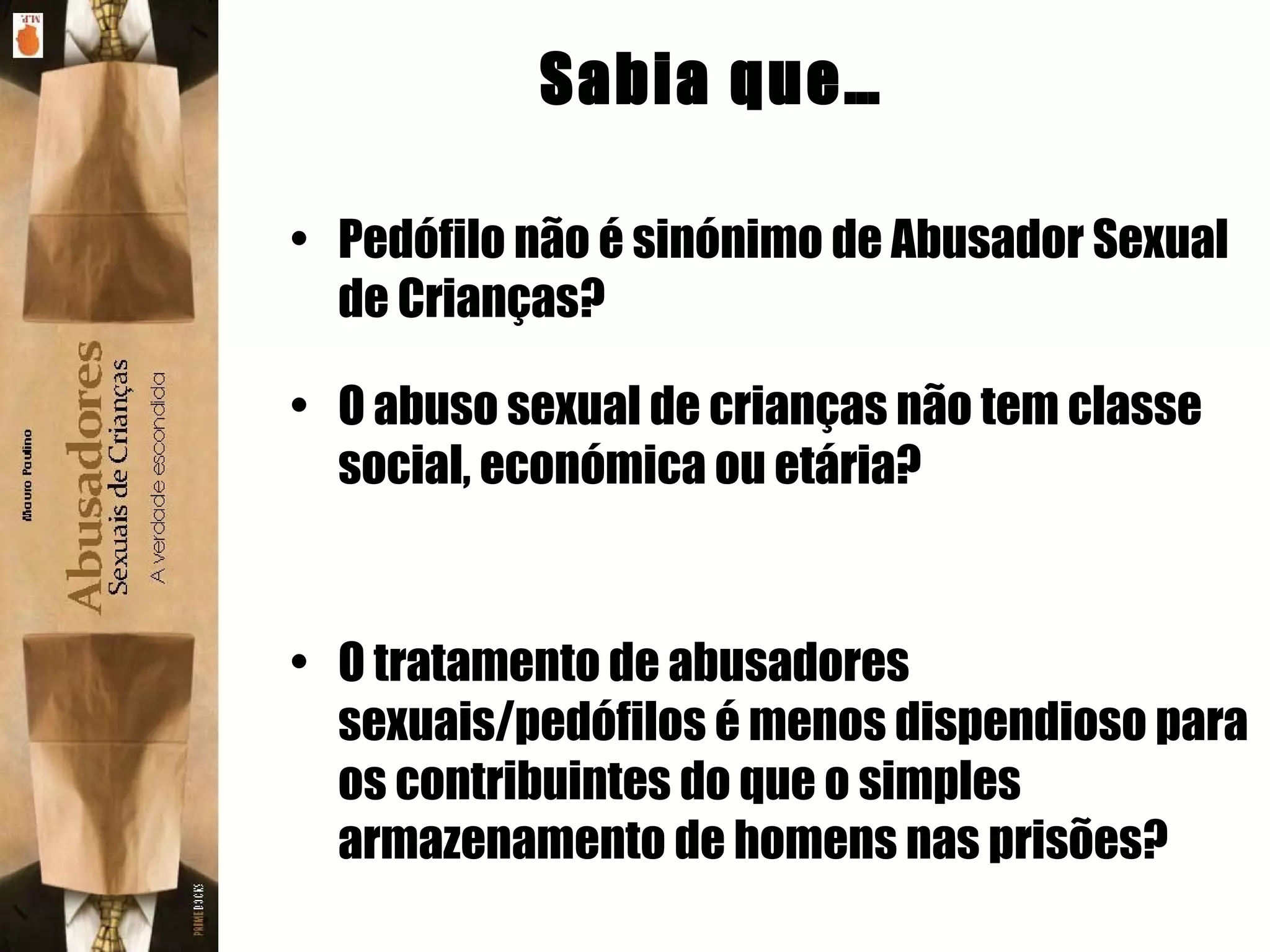 O documento discute o abuso sexual de crianças, explicando que pedófilos não são necessariamente abusadores e que o tratamento de abusadores é menos dispendioso do que mantê-los presos. O documento também lista os tópicos abordados em um livro sobre abusadores sexuais de crianças, incluindo definições, prevalência, modelos explicativos e tratamento.