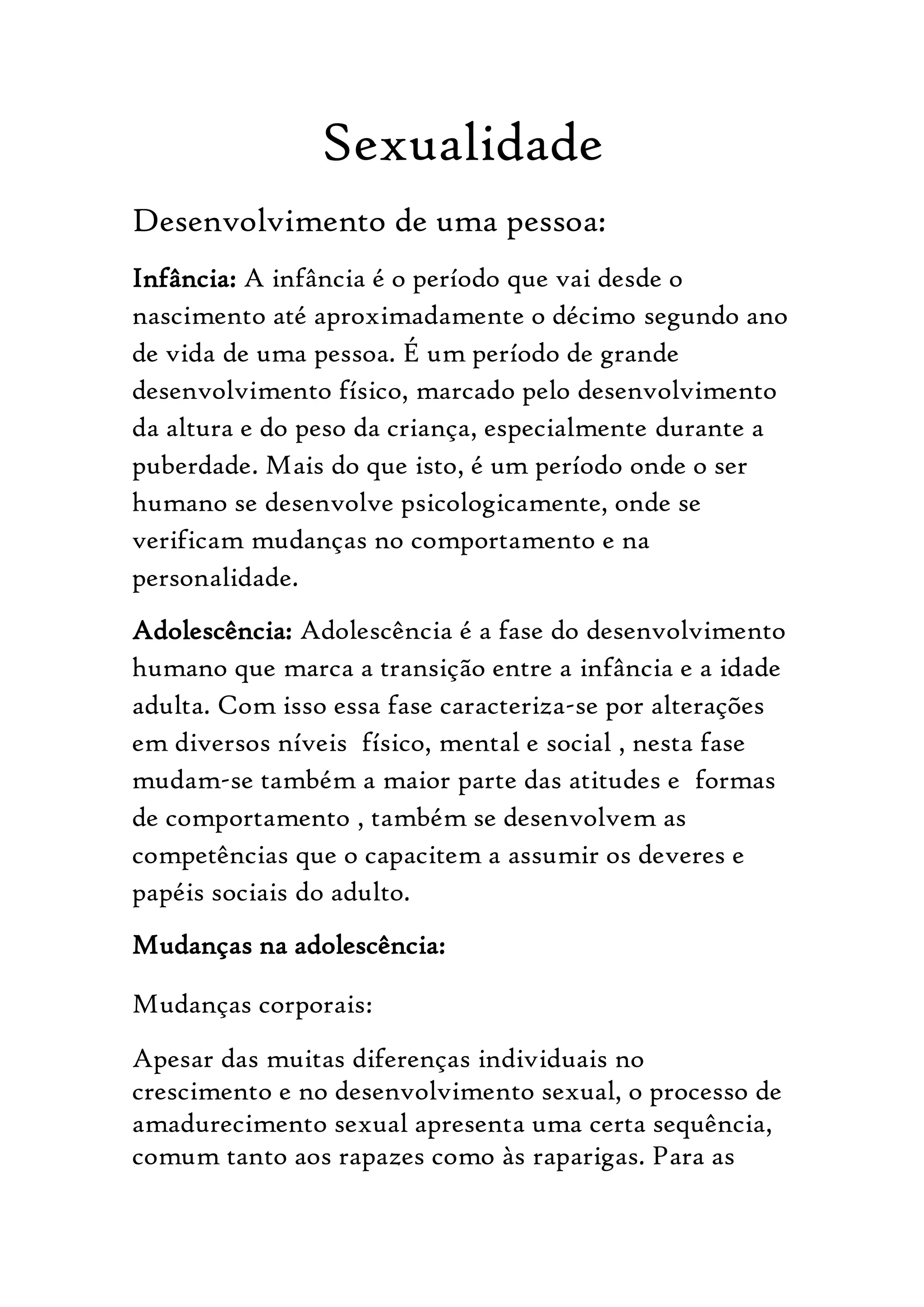 O documento descreve as principais etapas do desenvolvimento humano, incluindo a infância, adolescência e idade adulta. Durante a adolescência, ocorrem grandes mudanças físicas como o crescimento dos pelos e órgãos sexuais. Na idade adulta, a terceira idade geralmente se refere às pessoas com mais de 60 ou 75 anos.