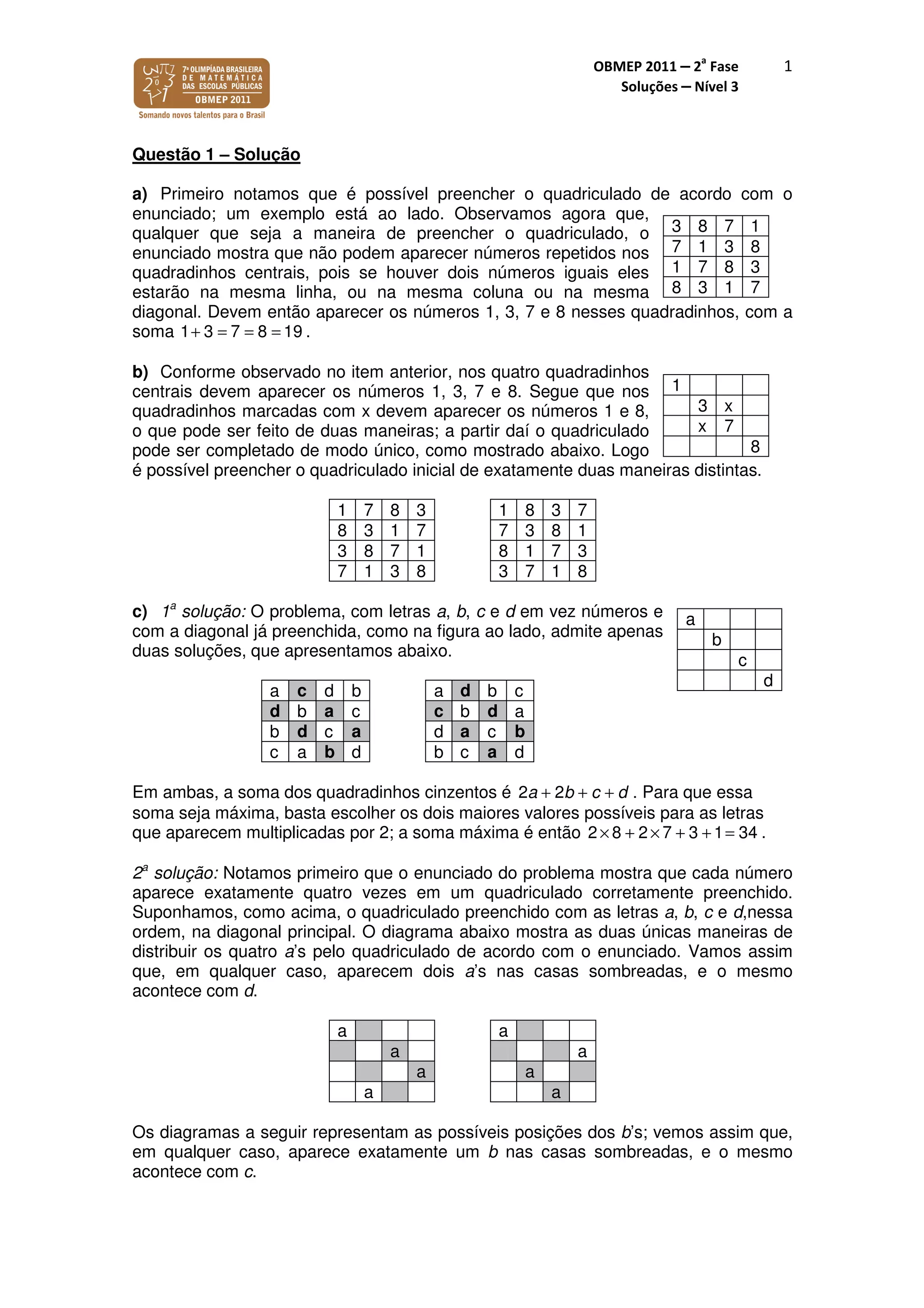 1) O documento apresenta soluções para questões de um exame de matemática sobre preenchimento de quadriculados e sequências numéricas. 2) As soluções incluem preenchimento de quadriculados de forma única e máxima soma, além de análise de sequências de Fibonacci. 3) A lonjura de pontos é calculada através de poligonais que passam por pontos de coordenadas inteiras.
