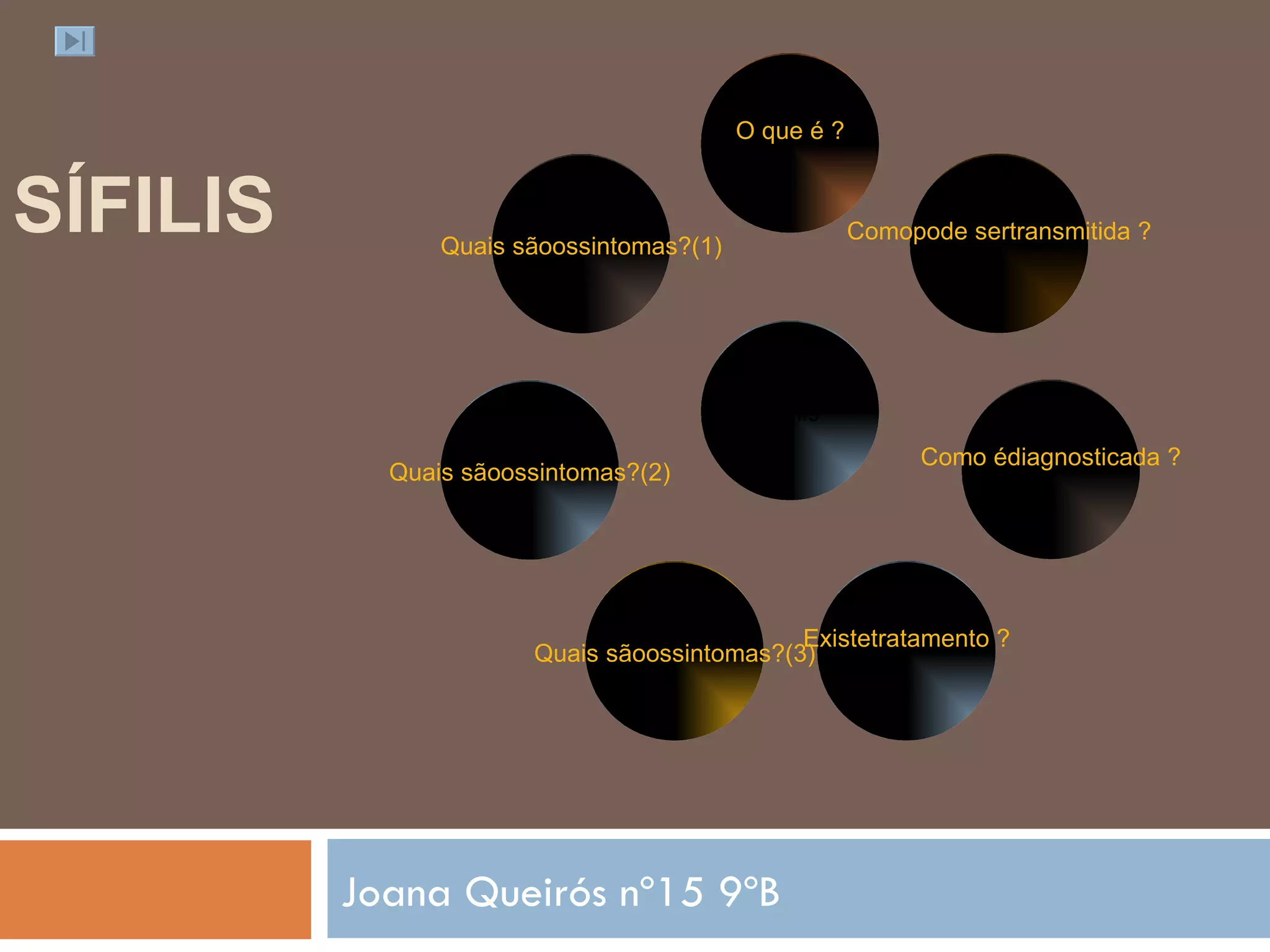 A sífilis é uma doença infecciosa causada pela bactéria Treponema pallidum que evolui em três estágios caracterizados por lesões na pele e mucosas. É transmitida principalmente por contato sexual e da mãe para o feto. Os sintomas variam desde lesões na pele até danos nos órgãos com o passar do tempo, mas pode ser diagnosticada por exames e tratada com antibióticos como a penicilina.