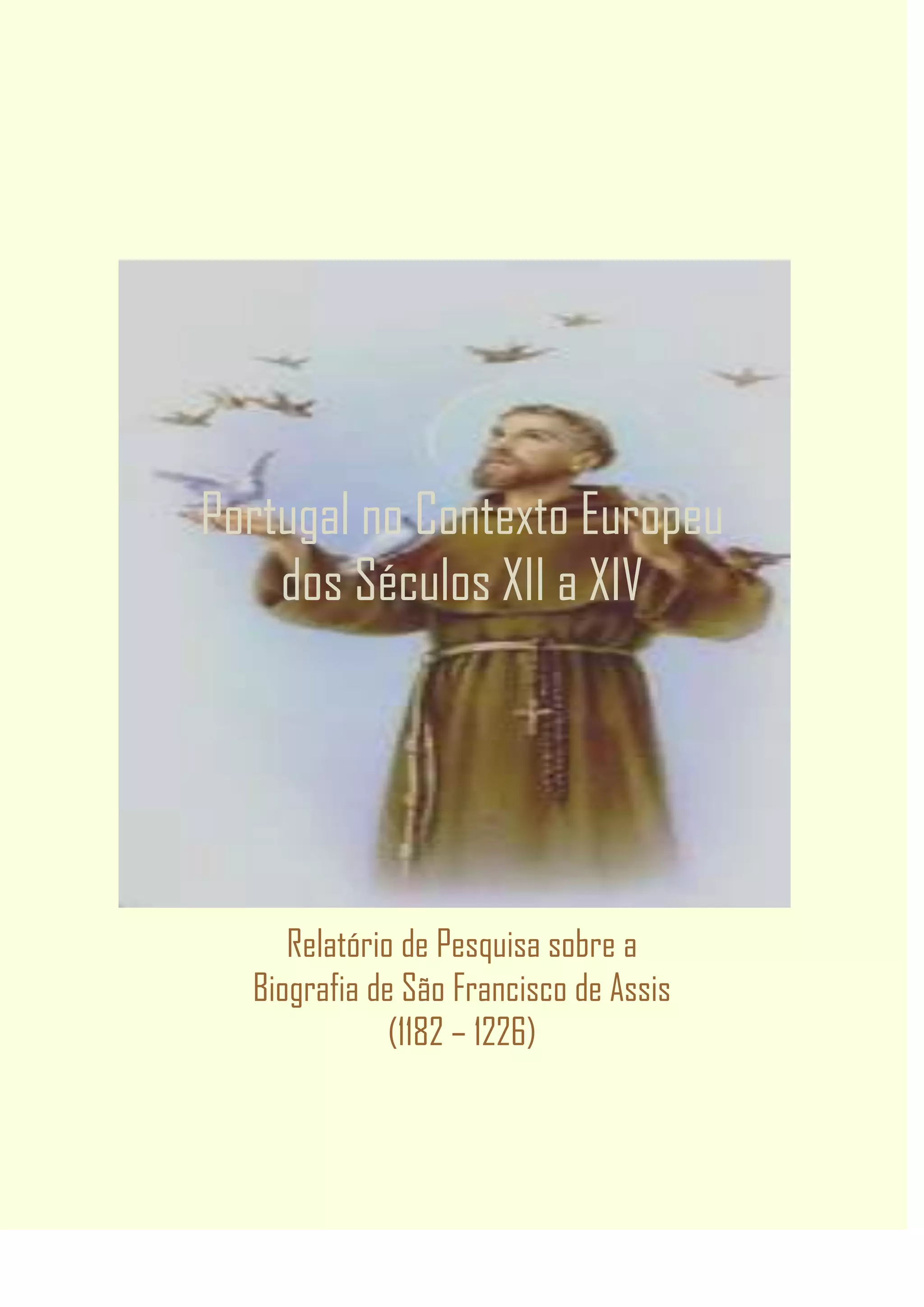 O documento descreve a biografia de São Francisco de Assis, incluindo sua conversão religiosa, fundação da Ordem Franciscana, anos finais e morte. São Francisco viveu nos séculos XII-XIII e dedicou sua vida aos pobres e doentes, pregando a palavra de Deus e renovando o Cristianismo por meio da pobreza absoluta.