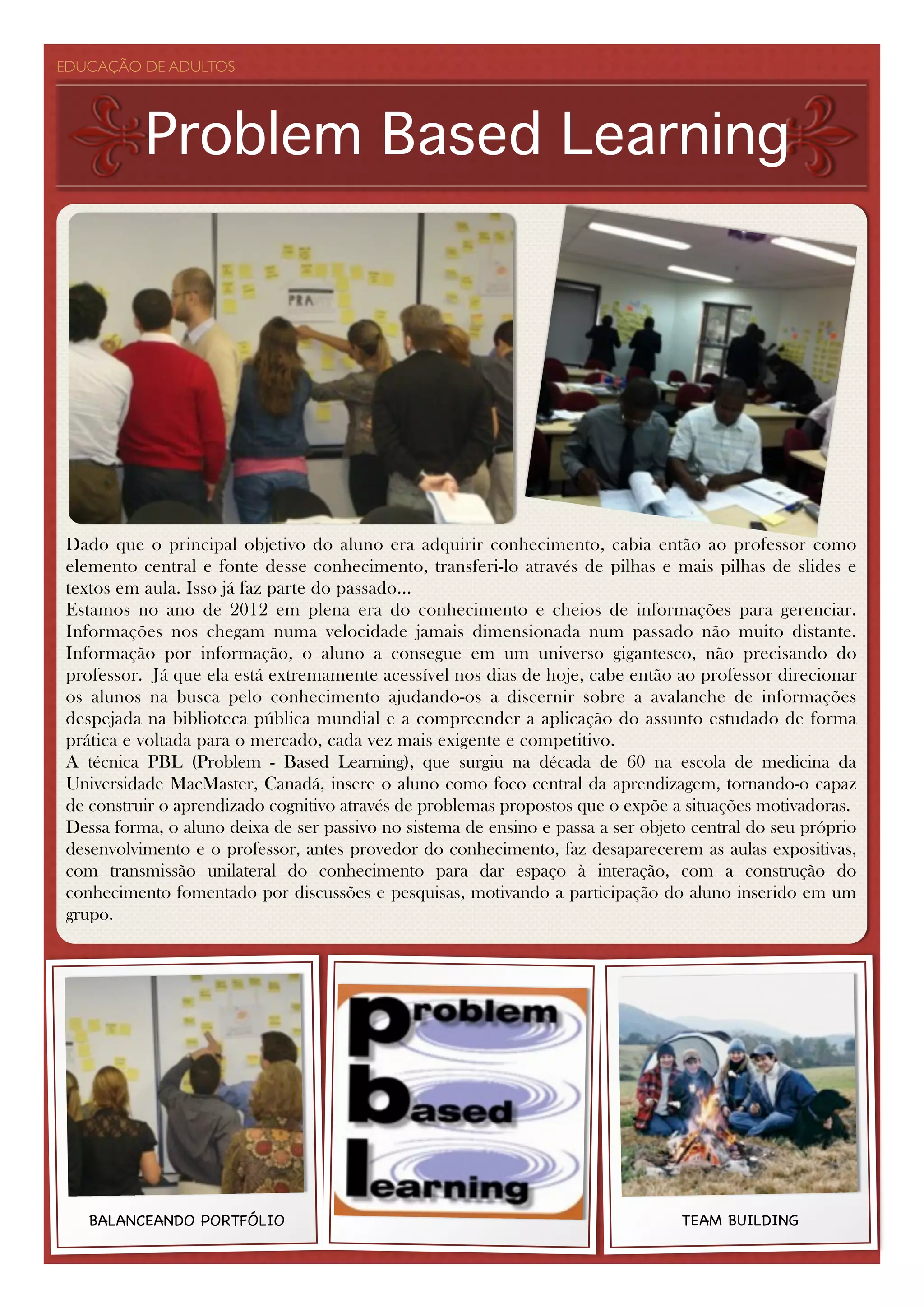 O documento discute o método de aprendizagem baseado em problemas (PBL), no qual os alunos aprendem a resolver problemas reais em grupos ao invés de ouvirem palestras passivas. Isso motiva os alunos e os prepara melhor para o mundo real ao desenvolver habilidades como trabalho em equipe e pensamento crítico. O PBL torna os alunos o foco central da aprendizagem e o professor um facilitador, ao invés de um mero transmissor de conhecimento.