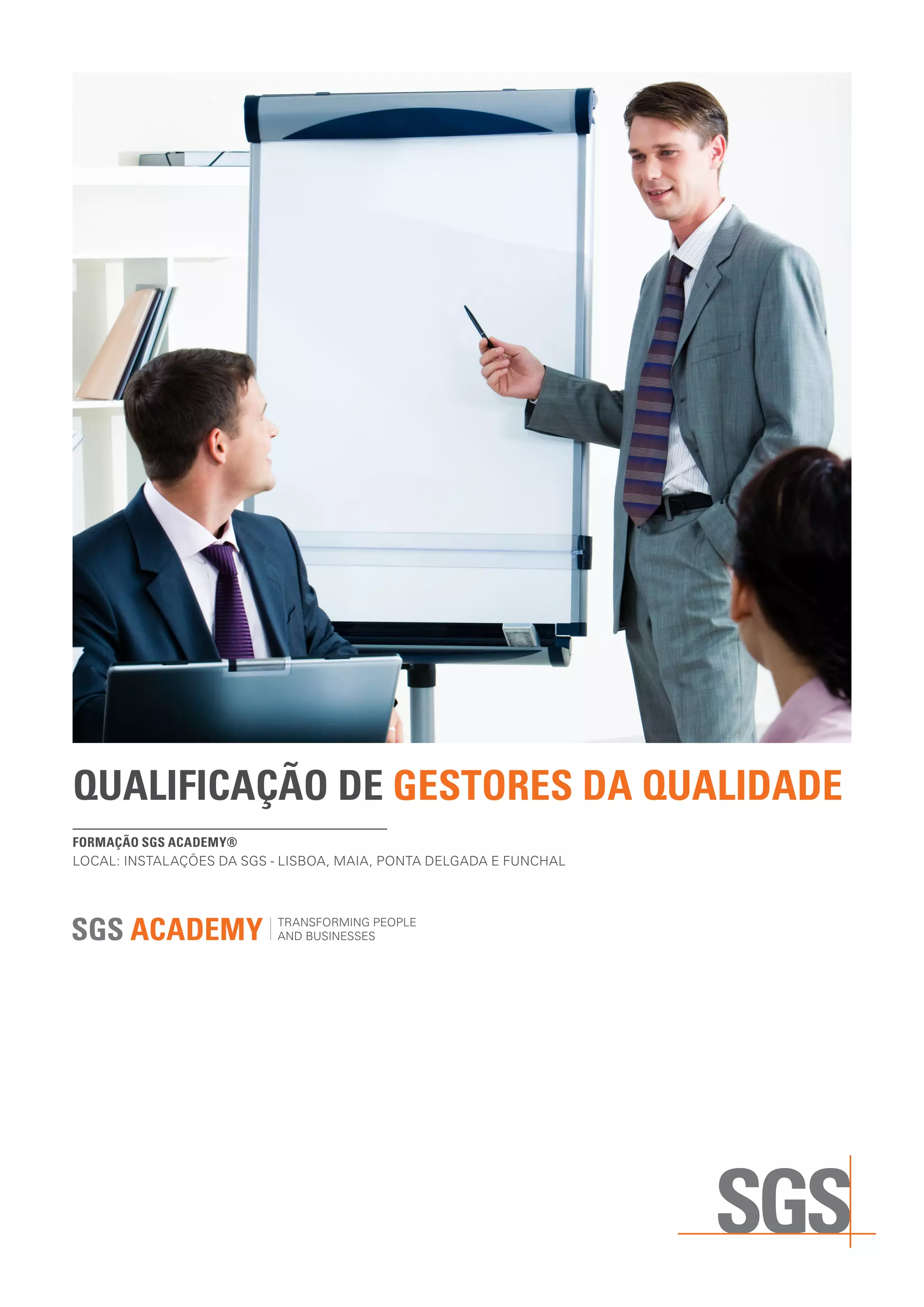 Este documento descreve um curso de qualificação de gestores da qualidade oferecido pela SGS Academy em Portugal. O curso ensina os conceitos e requisitos de sistemas de gestão da qualidade, ferramentas para análise e resolução de problemas, gestão de equipamentos de medição, funções de gestores da qualidade e auditorias. O curso dura 88 horas e é destinado a quem deseja adquirir competências na gestão da qualidade.