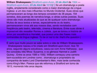 William Shakespeare foi um dramaturgo e poeta inglês considerado o maior dramaturgo da língua inglesa e um dos mais influentes do mundo ocidental. Ele escreveu 38 peças, 154 sonetos e outros poemas. Suas obras mais famosas incluem Romeu e Julieta, que se tornou a história de amor por excelência, e Hamlet, que contém a famosa frase "Ser ou não ser".