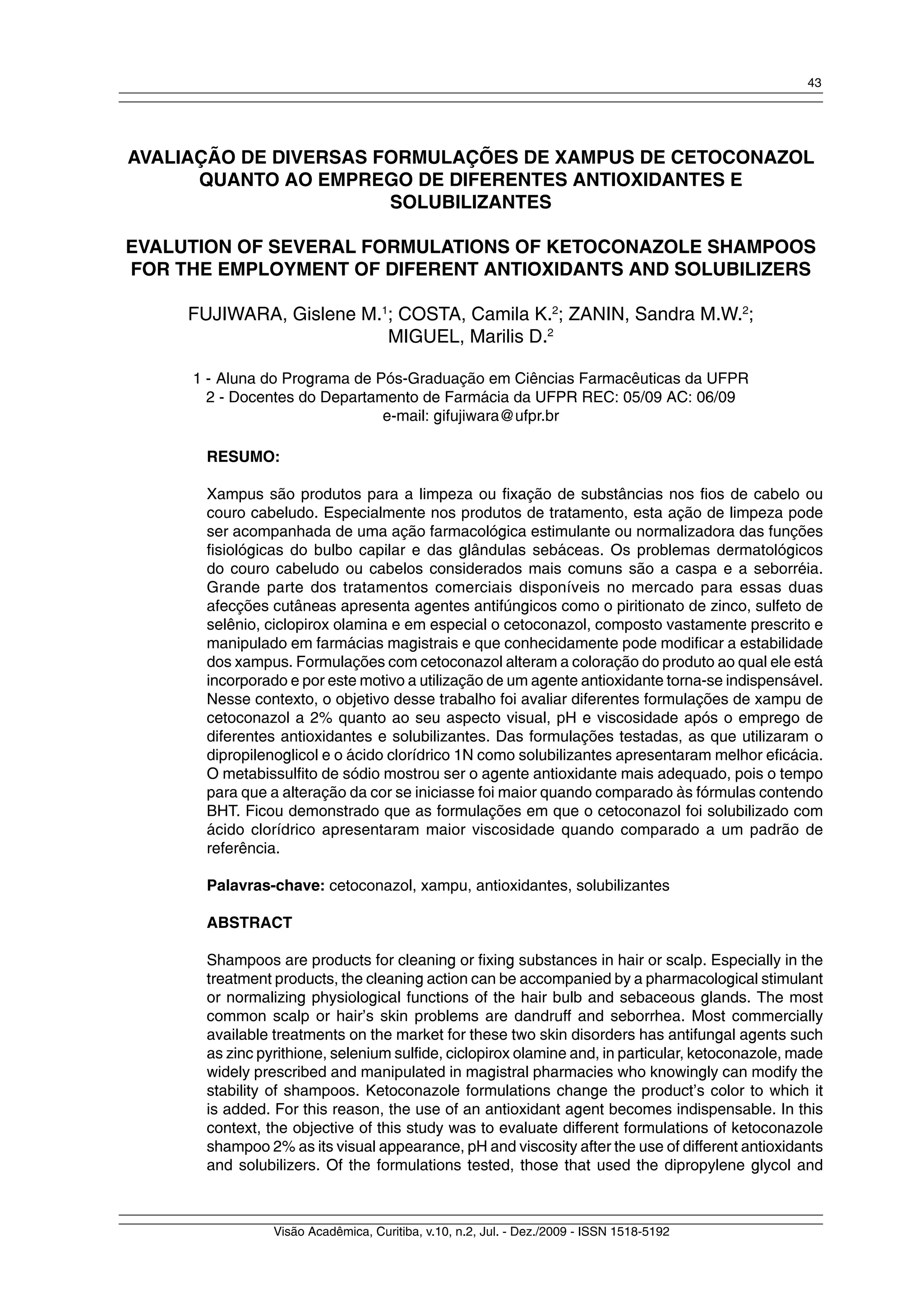2. Foi avaliado o efeito de diferentes antioxidantes e solubilizantes nas características de aspecto visual, pH e viscosidade dos xampus.