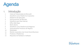 O documento fornece uma introdução geral ao Microsoft SharePoint, descrevendo suas principais funcionalidades como plataforma de colaboração e gestão de conteúdo, incluindo sites, comunidades, conteúdo, percepções, pesquisa e composições. Apresenta também requisitos técnicos, suporte a dispositivos móveis e informações de contato.