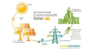 O documento discute a geração compartilhada de energia por meio de cooperativas ou consórcios, onde os consumidores podem gerar sua própria energia de fontes renováveis. A energia excedente pode ser compartilhada entre os membros ou fornecida à rede elétrica, gerando economia na conta de luz. Também apresenta linhas de crédito para financiar projetos de geração renovável e simulações de financiamento para uma cooperativa solar.