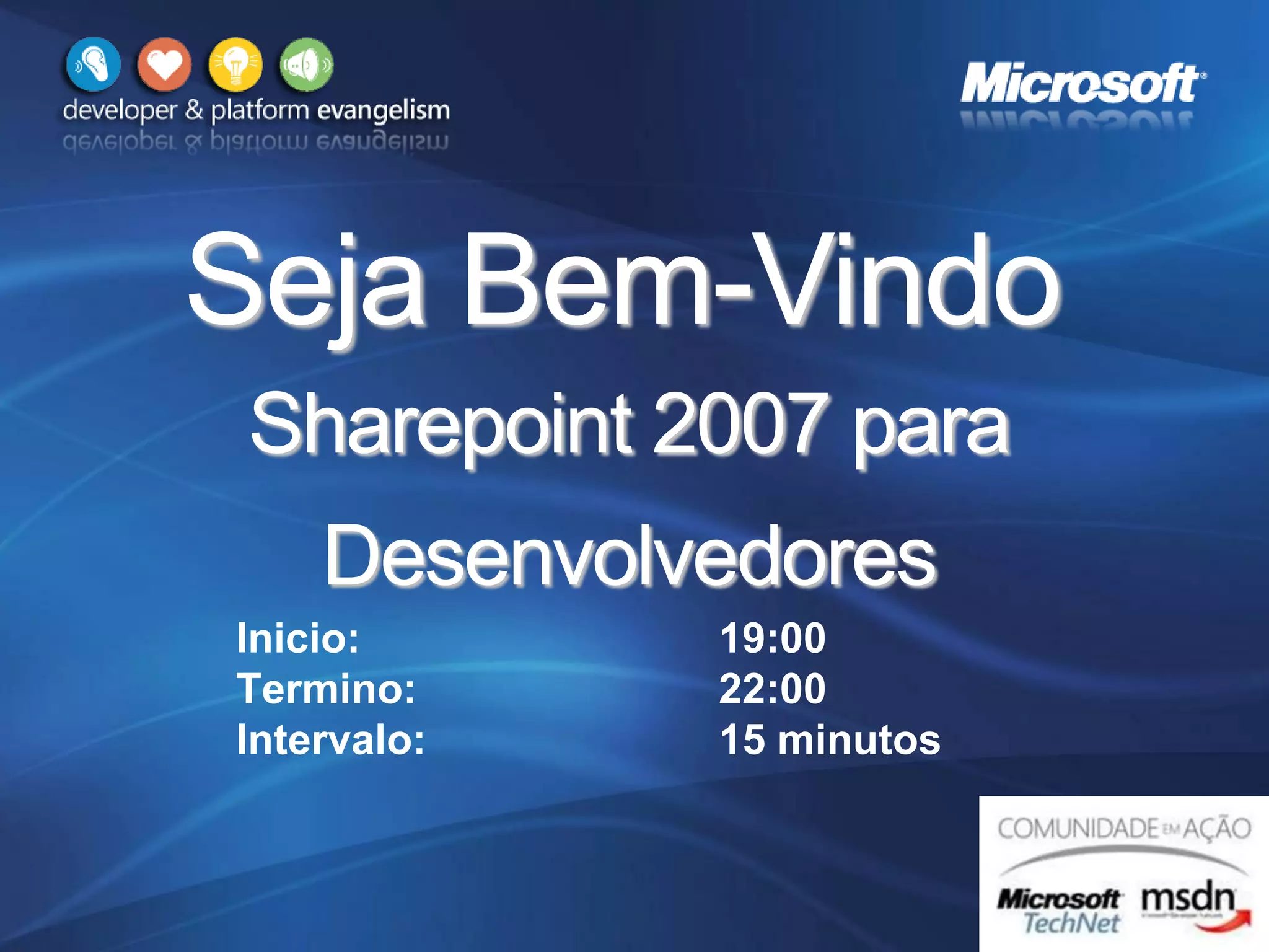 O documento apresenta uma palestra sobre SharePoint 2007 para desenvolvedores, abordando conceitos básicos como utilização de listas, customização de layout, criação de workflows, acesso a dados externos, customização de procura e criação de formulários com InfoPath.