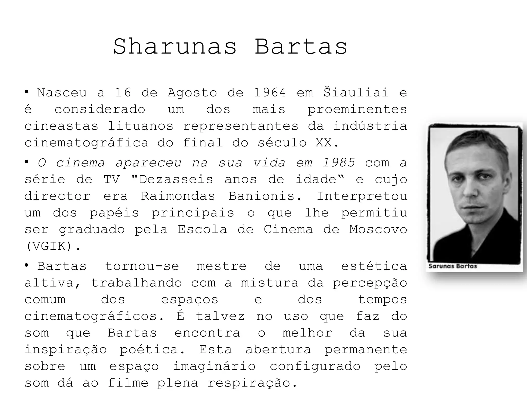 Sharunas Bartas é um cineasta lituano nascido em 1964. Ele é considerado um dos mais proeminentes diretores da Lituânia no final do século XX. Seus filmes abordam a independência da Lituânia da União Soviética e lidam com temas como perda de comunicação e sentimentos de inutilidade. Seus filmes são marcados por longas tomadas, close-ups e trilha sonora minimalista.