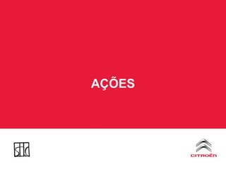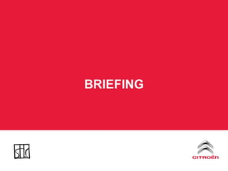 BRIEFING Lançamento emSetembro de 2010; NÃO SOMOS A MONTADORA; Gerar fluxo para as lojas, contato com o carro novo e vendas; Exposição com toda a linha Citroën, não apenas o lançamento; Além das ações tradicionais, ações que causem impacto no público, chamem a atenção, diferenciem-se; As ações devem limitar-se à região de São Paulo.