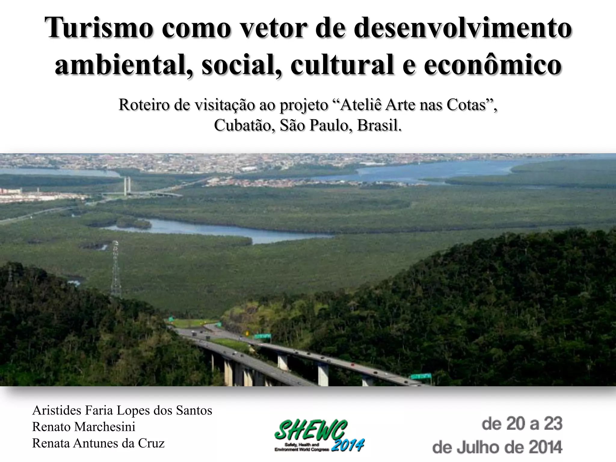 O documento discute o turismo como uma ferramenta de desenvolvimento social, econômico e cultural, especificamente através do projeto 'Ateliê Arte nas Cotas' em Cubatão, São Paulo. Ele detalha a metodologia de pesquisa, os resultados preliminares e a importância do turismo de base comunitária na promoção da identidade cultural e transformação socioeconômica local. O projeto visa envolver a comunidade local e visitantes em uma experiência educacional e de valorização do patrimônio cultural.