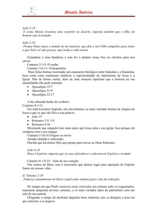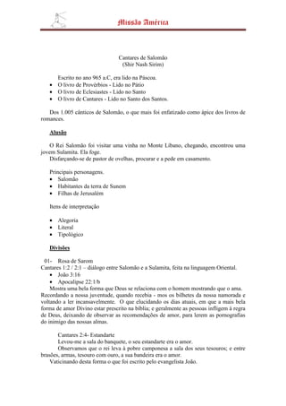 O documento resume o livro bíblico de Cantares de Salomão, descrevendo sua data de escrita, personagens e divisões. Alegoriza o livro como representando o amor entre Deus e Sua igreja, comparando passagens com outros livros bíblicos como João e Apocalipse. Conclui afirmando que Jesus ama Sua igreja e sela os crentes até o dia de Sua redenção.