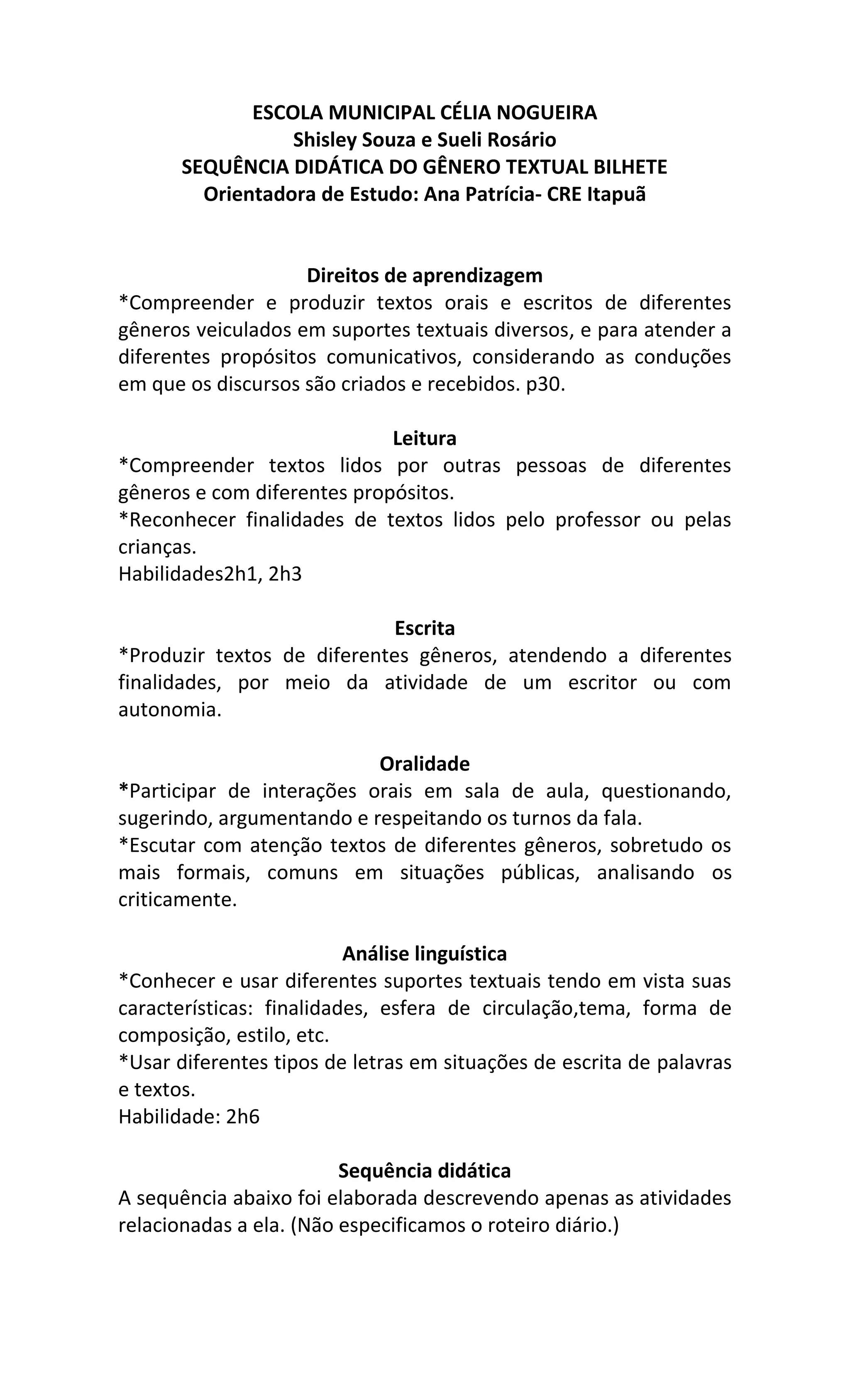 1) A sequência didática apresenta atividades para ensinar o gênero textual "bilhete" para estudantes do ensino fundamental.