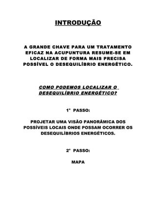 O documento descreve a técnica Shu-Mo da medicina tradicional chinesa. A técnica envolve a combinação de pontos de alarme e pontos de assentimento para equilibrar o yin e yang de cada órgão e viscera, identificando três locais possíveis de desequilíbrio energético: os cinco elementos, os órgãos de cada elemento, e o órgão em si. A técnica é usada principalmente para casos crônicos de desequilíbrio energético.