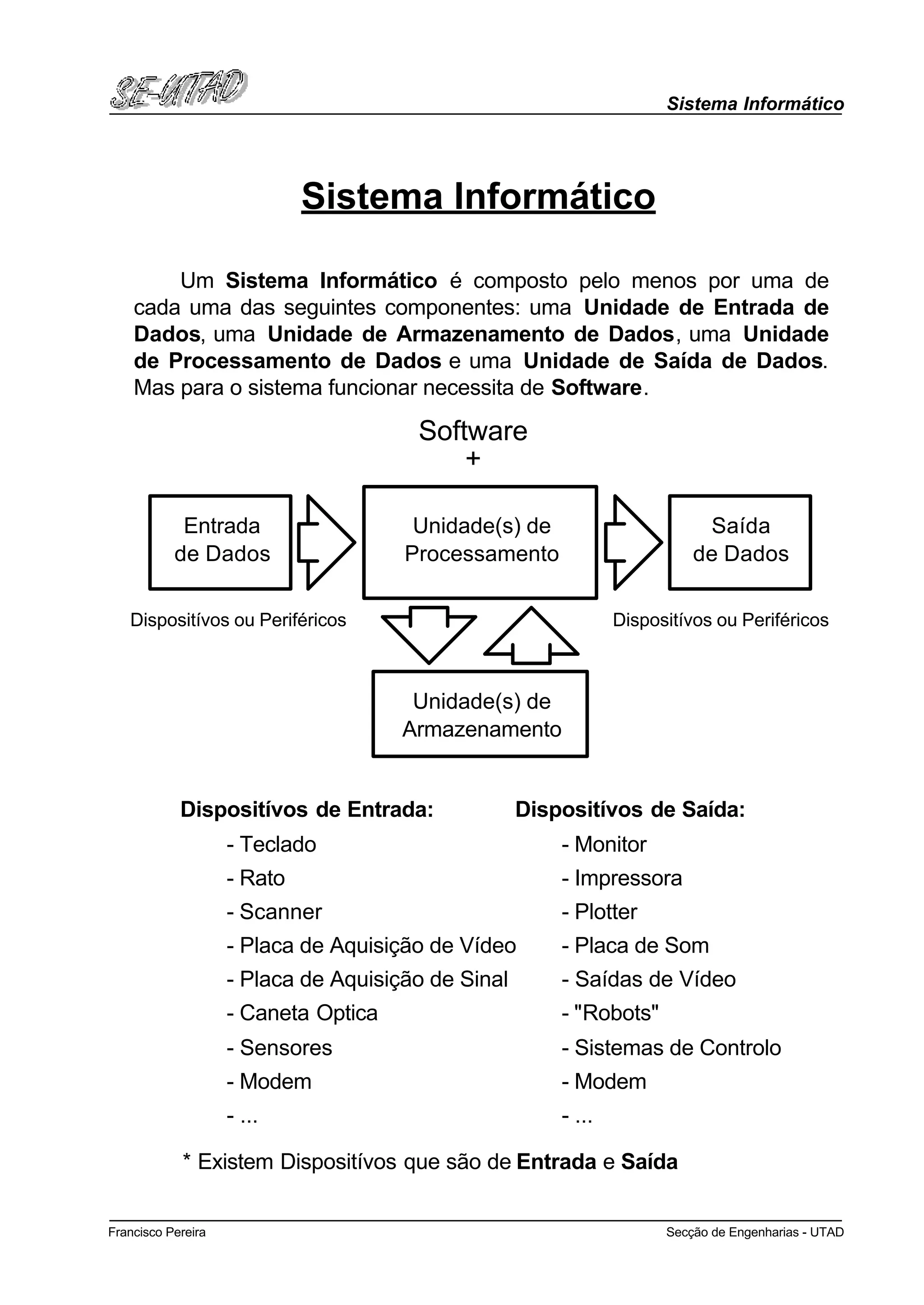 O documento descreve os principais componentes de um sistema informático, incluindo unidades de entrada e saída, armazenamento, processamento e software. Detalha dispositivos comuns de entrada e saída e explica que um sistema precisa de pelo menos uma unidade de cada um destes componentes. Também descreve os componentes principais de um computador pessoal.