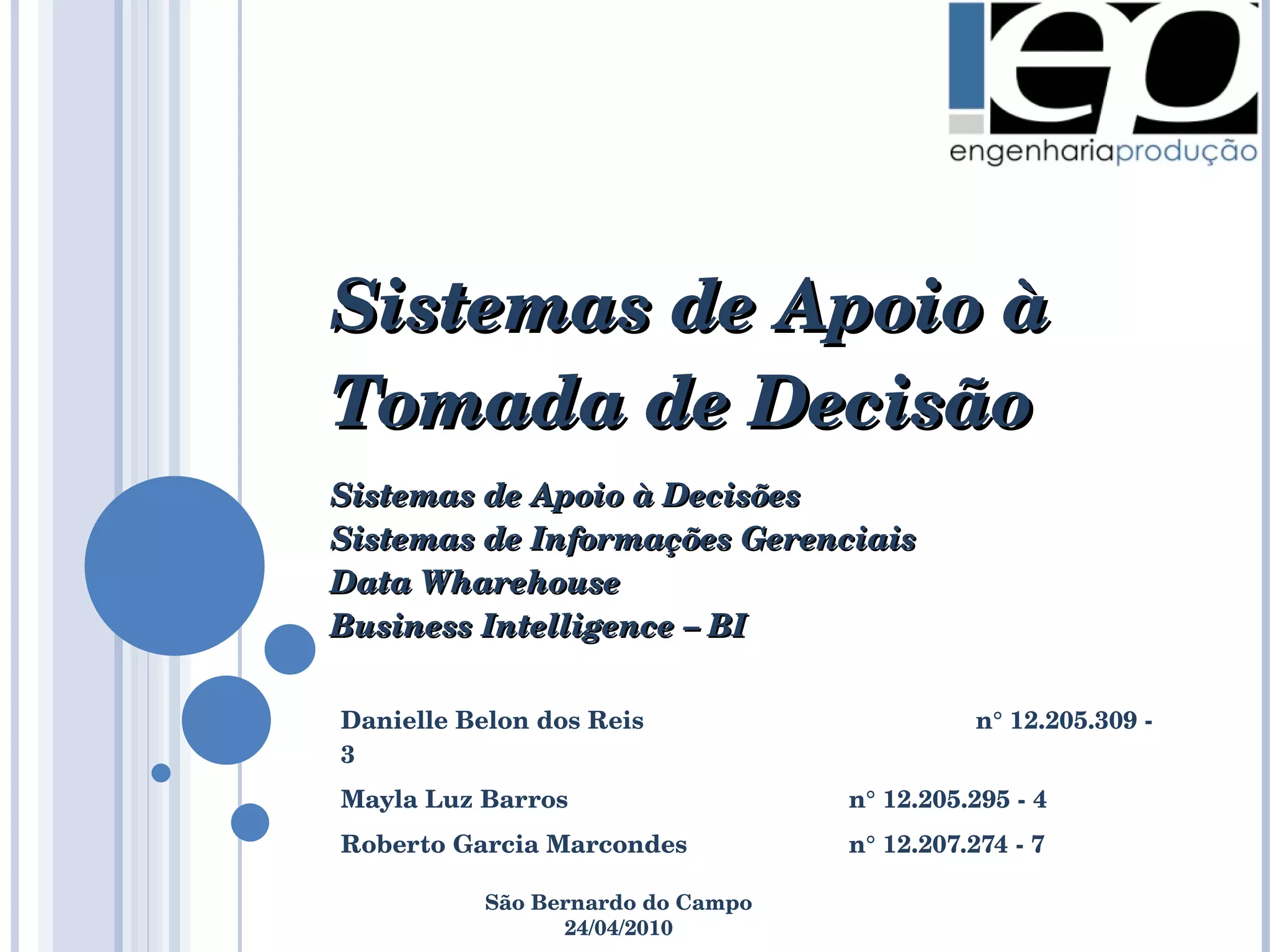 O documento discute sistemas de apoio à tomada de decisão e business intelligence. Apresenta conceitos como racionalidade limitada, tipos de decisões, sistemas de apoio à decisão, OLAP, data warehouse, ETL e data mining, explicando como esses elementos auxiliam os processos de tomada de decisão nas organizações.
