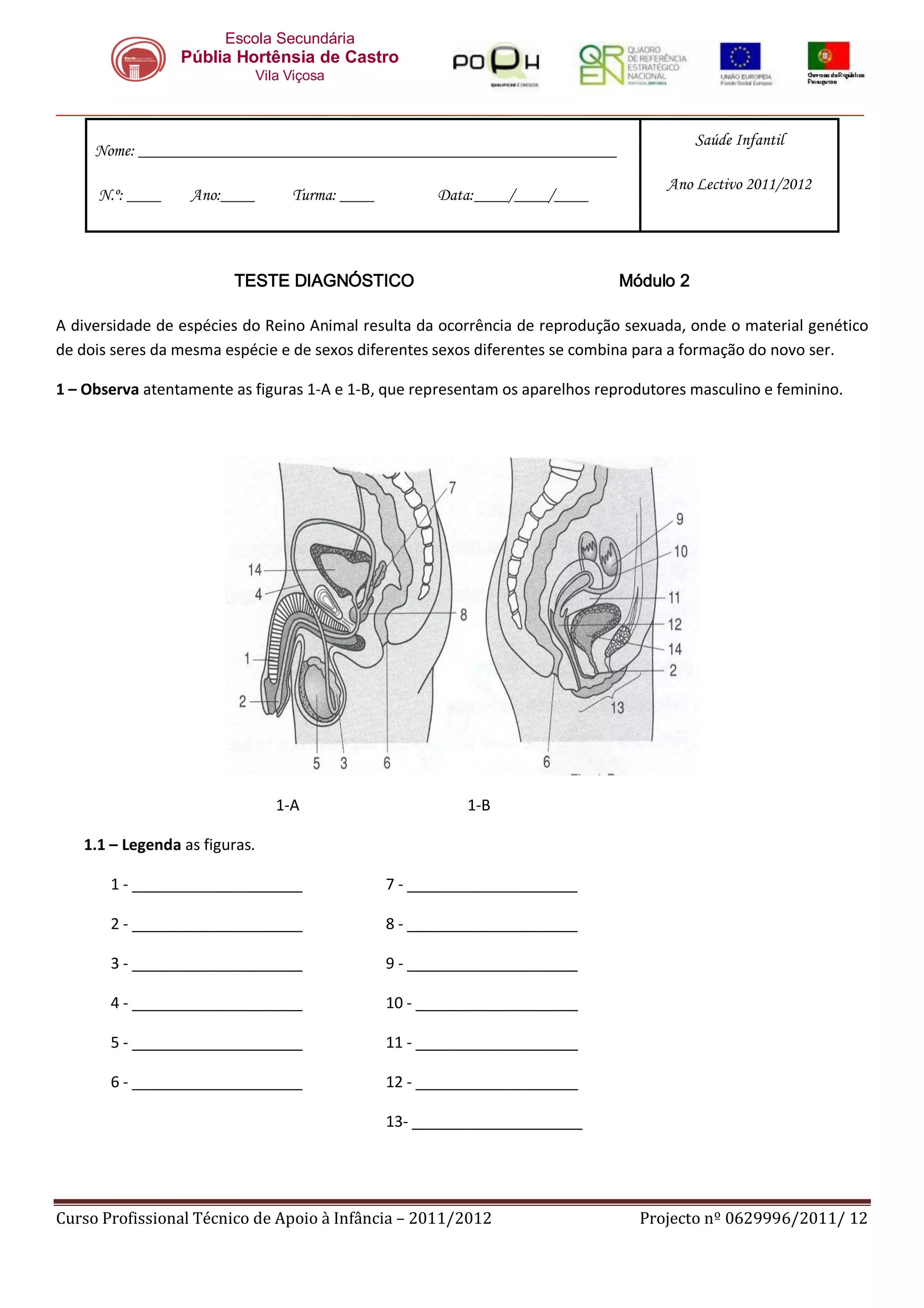 Este documento é um teste diagnóstico sobre saúde infantil que contém perguntas sobre reprodução humana, contracepção, doenças sexualmente transmissíveis e genéticas. As questões abordam tópicos como a formação das células sexuais, fecundação, desenvolvimento embrionário, hormônios femininos, métodos contraceptivos e como ocorre a troca entre a mãe e o feto.