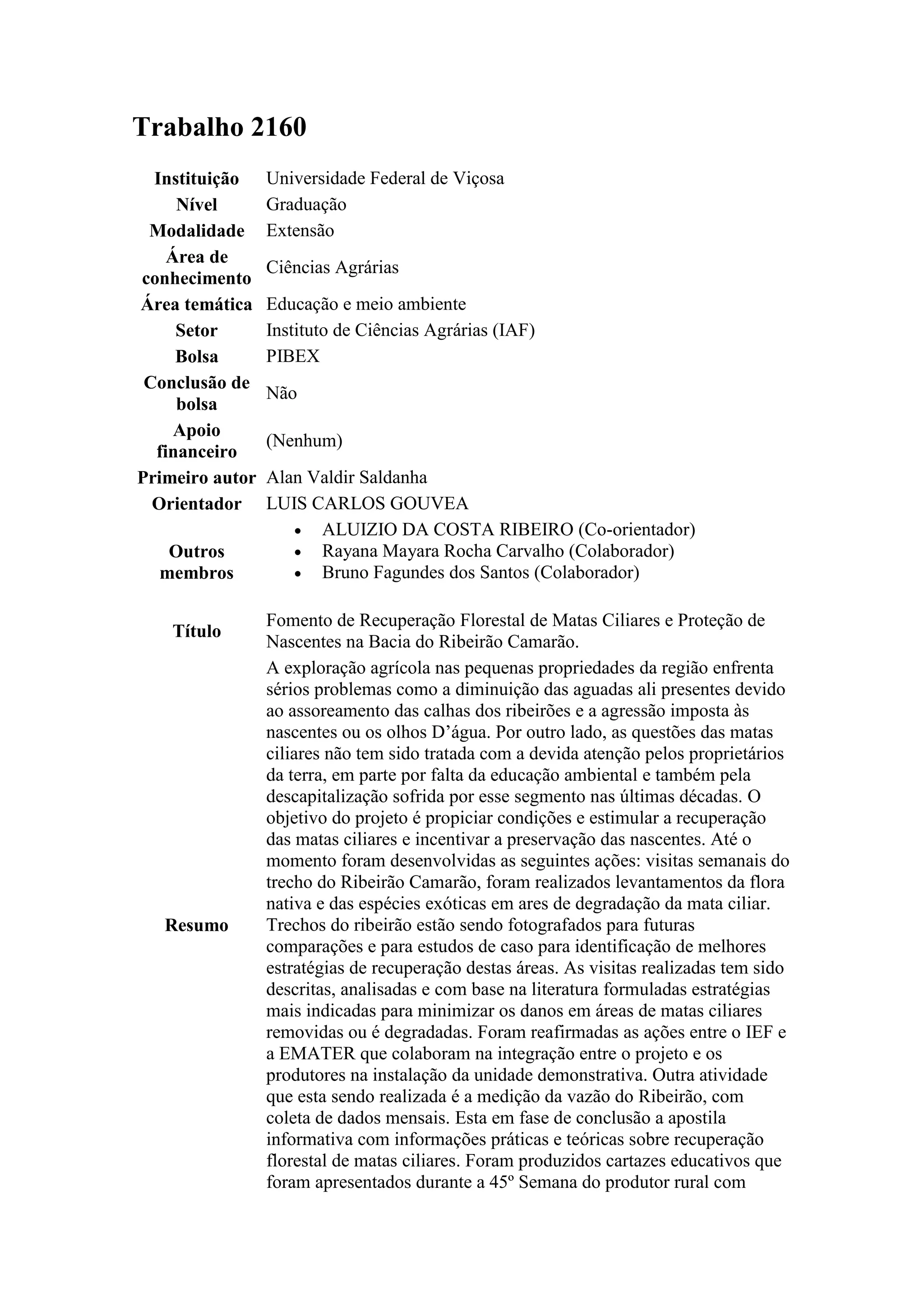 O projeto tem como objetivo estimular a recuperação de matas ciliares e preservação de nascentes na bacia do Ribeirão Camarão através de ações como levantamentos de flora, fotografias para comparar recuperação, estratégias para minimizar danos, e educação de produtores e comunidade. Até o momento, foram realizadas visitas semanais ao ribeirão, produzidos materiais educativos e integração com outras instituições para apoiar produtores rurais.