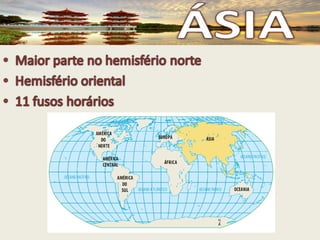 População: Mais de3,9 bilhões de habitantes Maior continente: 30% das terras emersas Área aproximada: 44 milhões Km²