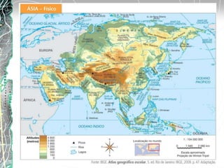 Este documento resume as principais características da Ásia de Monções, incluindo seu clima, população e economia. A população é marcada por um sistema de castas na Índia que determina a mobilidade social e a diversidade étnica e religiosa devido ao hinduísmo. A economia é baseada na agricultura, especialmente arroz, e na indústria tradicional e de informática na Índia, apesar de a maioria dos países serem ainda subdesenvolvidos.