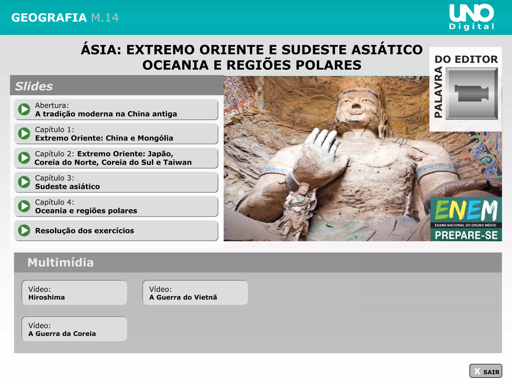 O documento apresenta informações sobre a geografia da Ásia Oriental e Sudeste Asiático, Oceania e regiões polares. Está dividido em quatro capítulos que abordam: 1) China e Mongólia; 2) Japão, Coreia do Norte, Coreia do Sul e Taiwan; 3) Sudeste Asiático; e 4) Oceania e regiões polares. Também inclui vídeos sobre eventos históricos como as bombas atômicas em Hiroshima e as guerras do Vietnã e da Coreia.