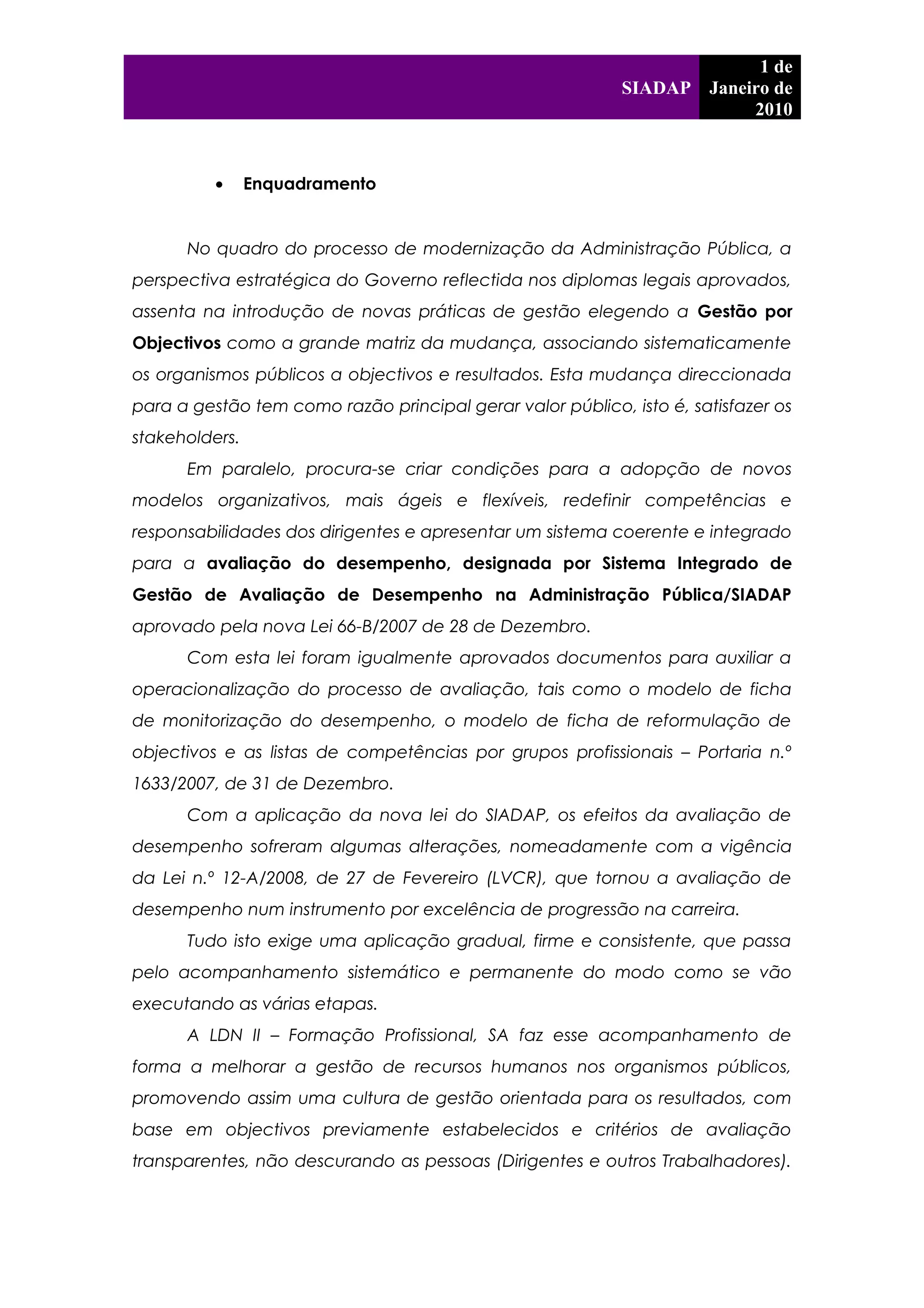 Este documento descreve o Sistema Integrado de Gestão e Avaliação de Desempenho na Administração Pública (SIADAP) e como a LDN II - Formação Profissional, SA oferece serviços de apoio na implementação do SIADAP, incluindo formação, monitorização e elaboração de relatórios.