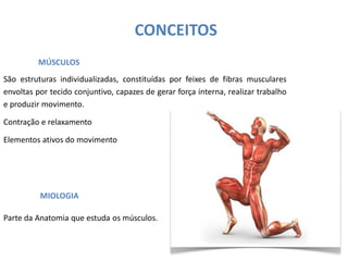 O documento discute conceitos básicos sobre o sistema muscular, incluindo: 1) Músculos são estruturas capazes de gerar força e movimento através da contração e relaxamento; 2) Existem diferentes variedades de músculos de acordo com o tipo de controle voluntário ou involuntário; 3) Músculos possuem propriedades como excitabilidade elétrica e contratilidade essenciais para sua função.