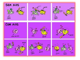 O documento descreve o que é a SIDA, como enfraquece o sistema imunitário e destrói a capacidade de defesa do corpo contra doenças. Explica também que a SIDA se transmite principalmente durante relações sexuais sem proteção ou pelo contato com sangue infectado ou de mãe para filho.