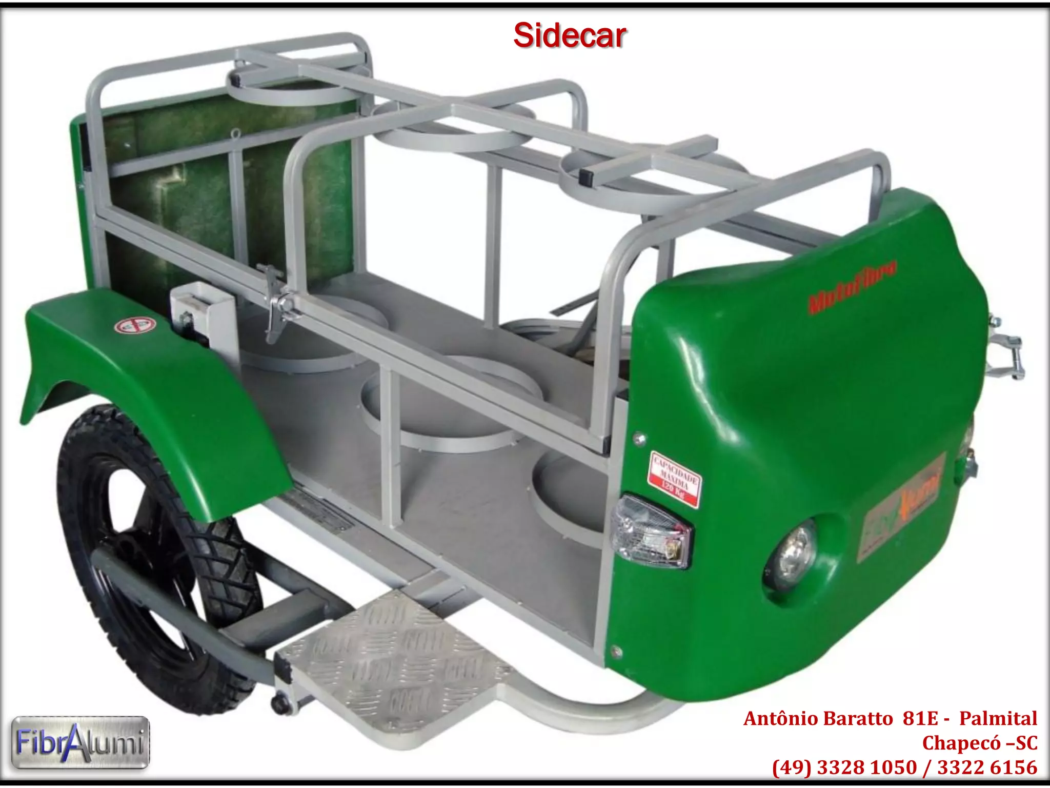 O documento apresenta o uso de sidecars como meio eficiente para entregas rápidas em cidades, destacando seu baixo custo de manutenção e consumo. Embora limitado em dias de chuva, o sidecar oferece uma boa relação custo-benefício em comparação com automóveis. Mais informações sobre os modelos disponíveis podem ser obtidas através do contato fornecido.